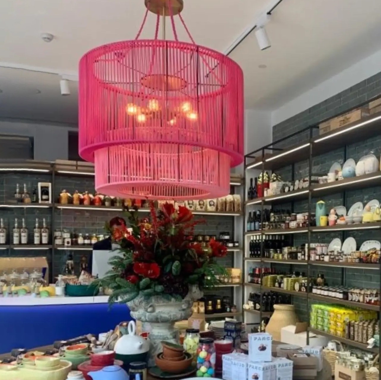 La lámpara colgante Cirano es una pieza decorativa de gran formato diseñada para aportar carácter, calidez y tendencia a cualquier espacio. Fabricada artesanalmente en nuestro taller, combina un armazón metálico de doble cilindro con un cuidadoso trabajo de cuerda trenzada, presentada en un vibrante color rosa, aunque también disponible en tonos neutros como blanco, crema, avellana o gris.