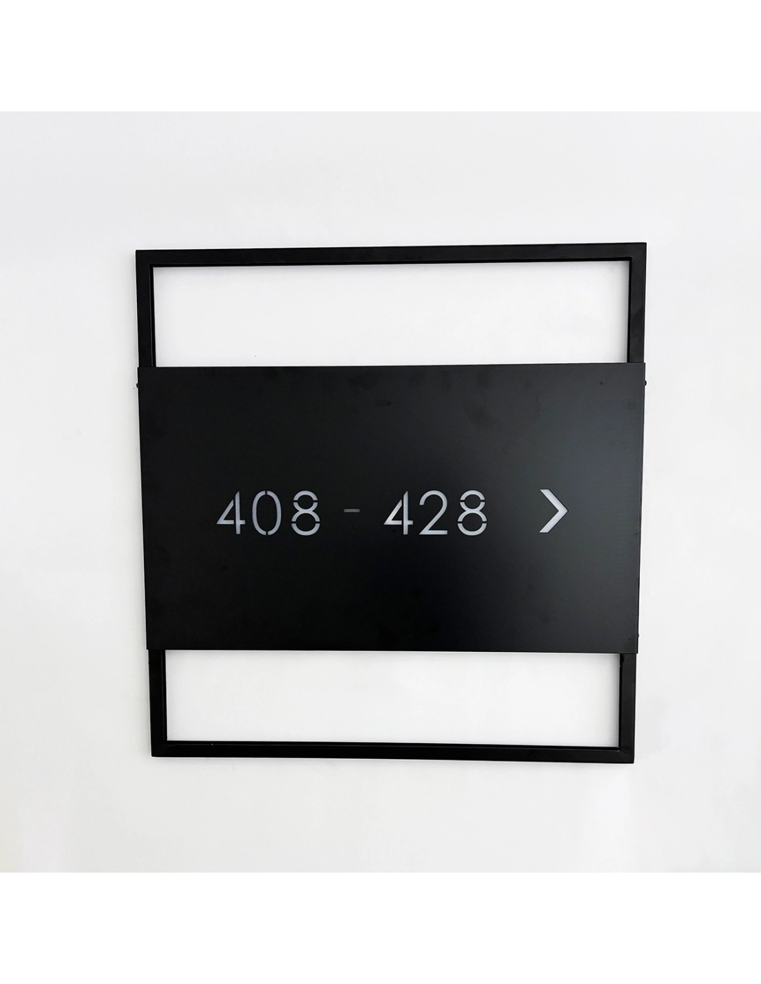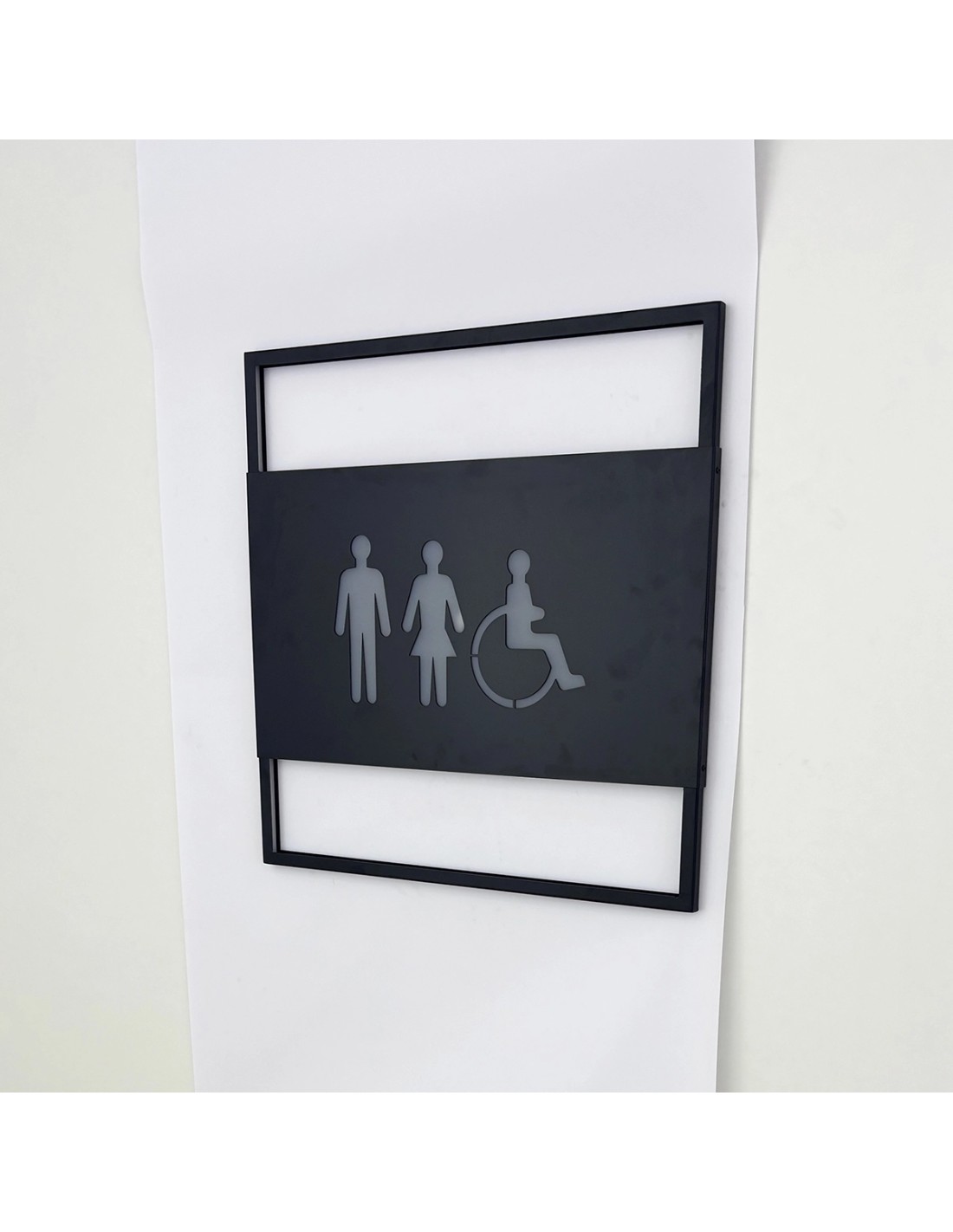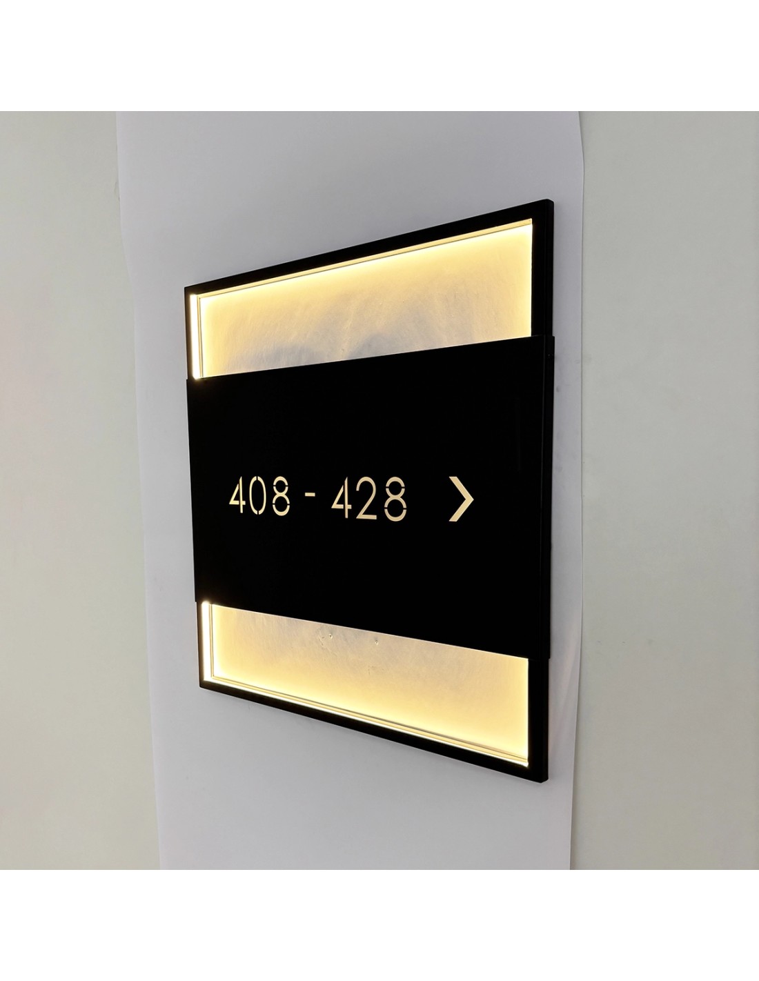 Su gran formato de 70 × 70 cm y la retroiluminación LED integrada proyectan una luz cálida sobre la pared, haciendo que la señalización sea visible, sofisticada y de gran impacto visual. El contraste entre el metal negro y la luz difusa crea un efecto decorativo que transmite lujo y exclusividad, ideal para proyectos de interiorismo de alto nivel.
