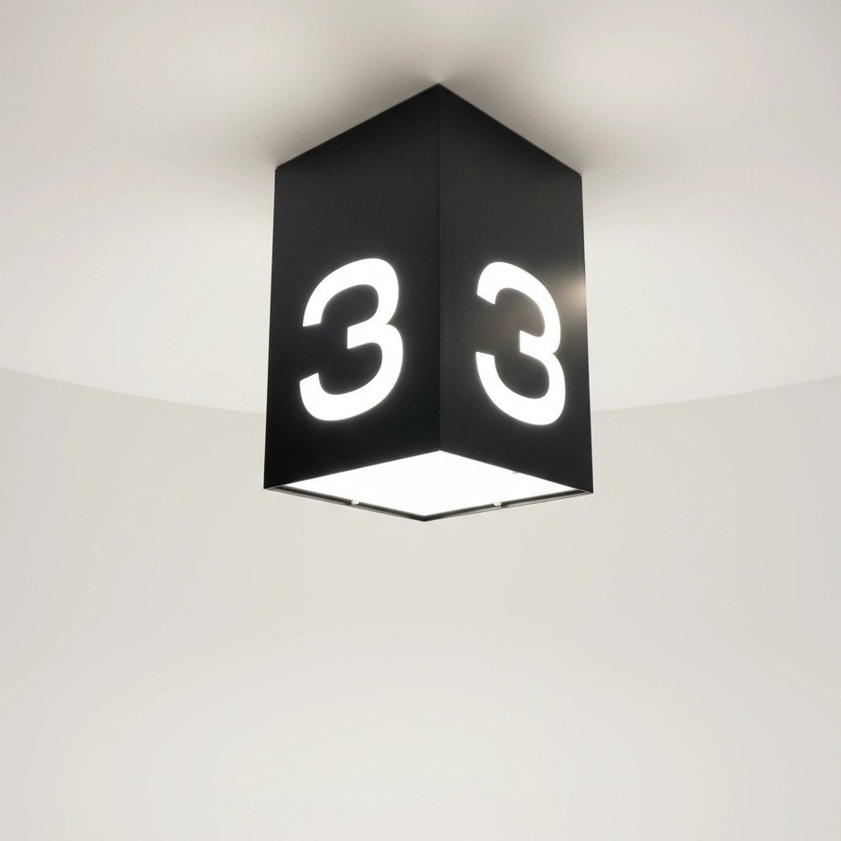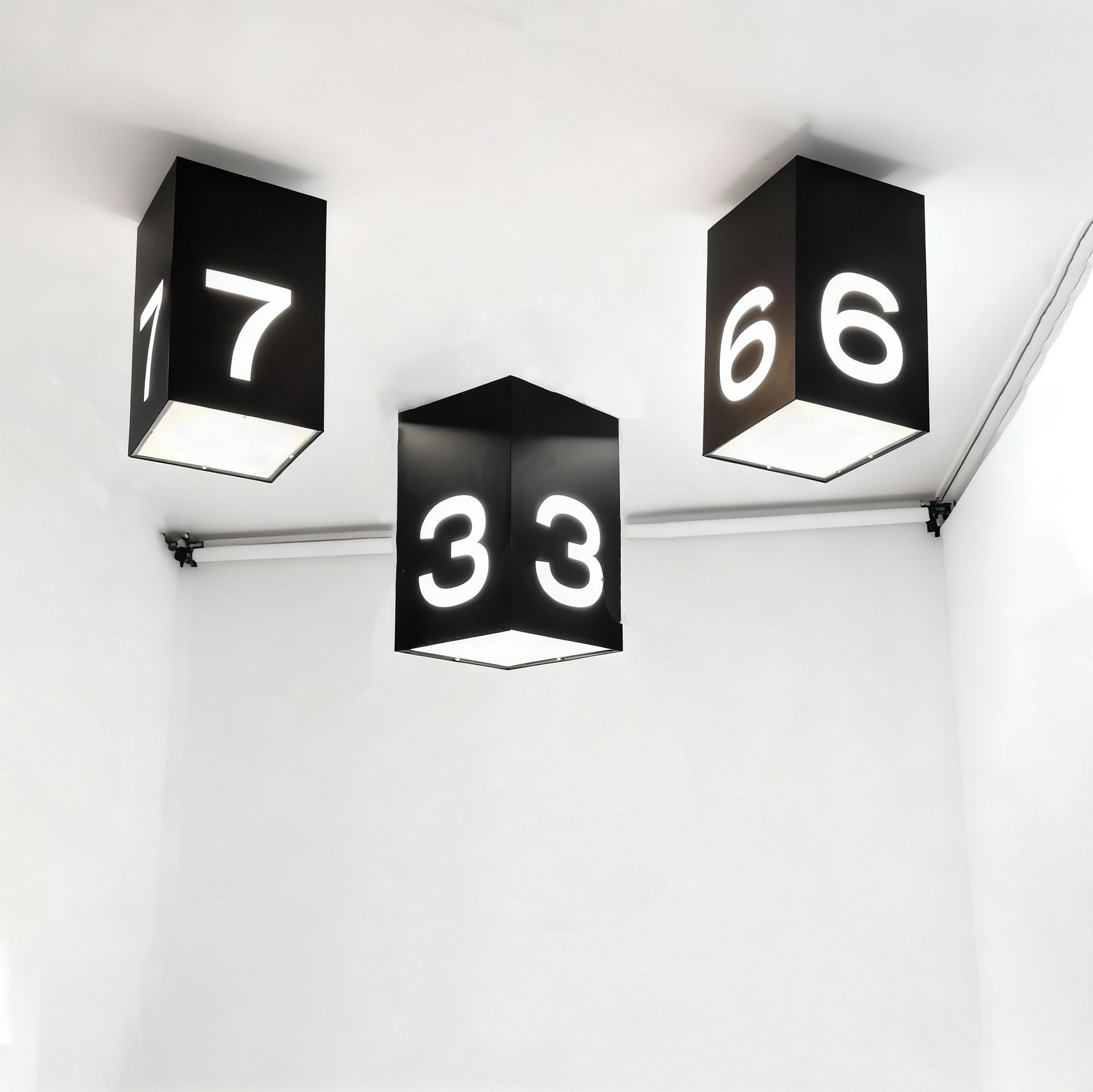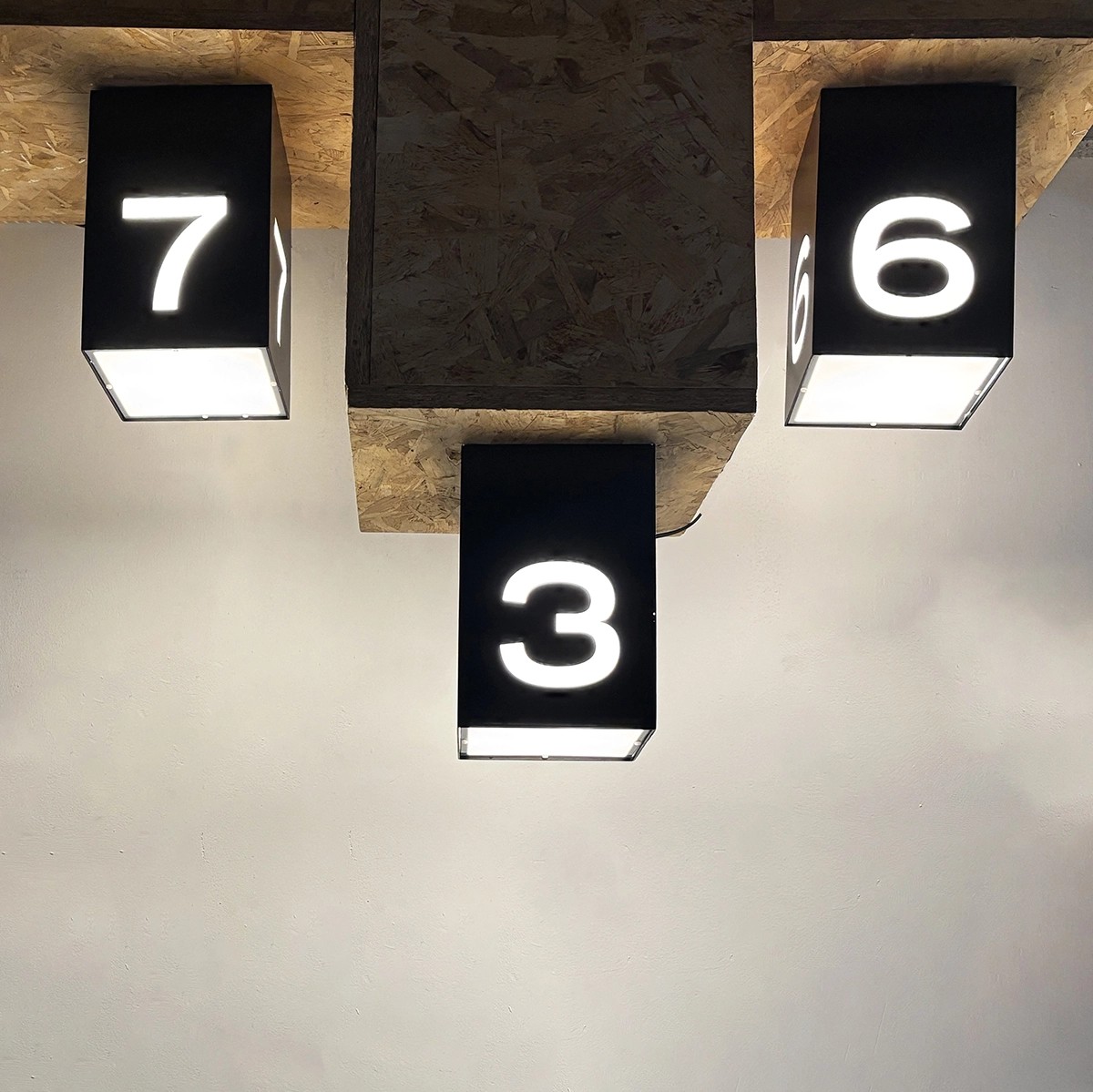 El número, cortado a láser sobre el metal, deja pasar la luz LED creando un efecto elegante, claro y perfectamente visible incluso en entornos con poca iluminación.
