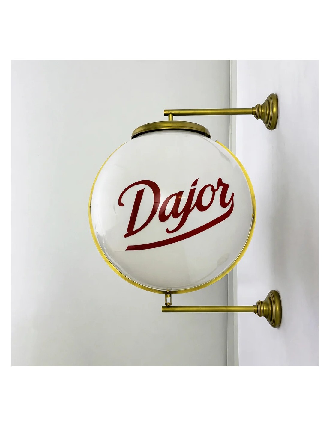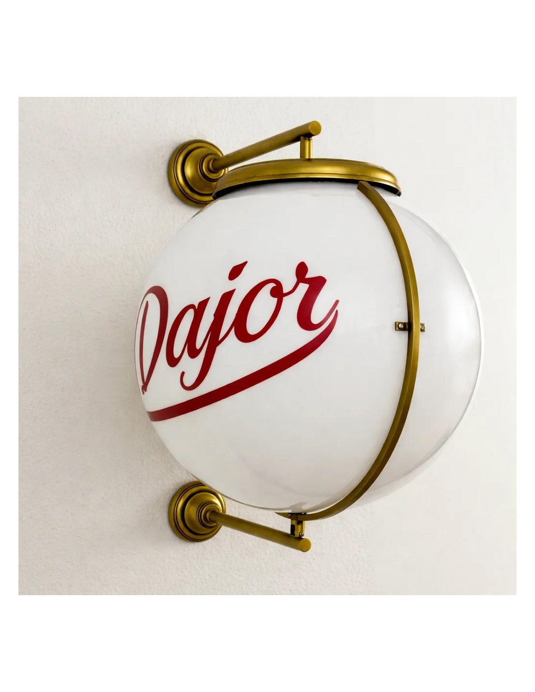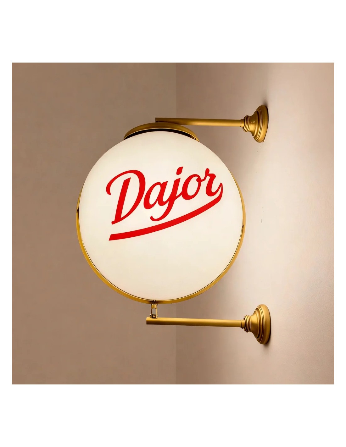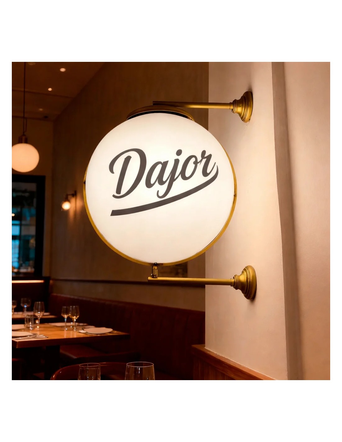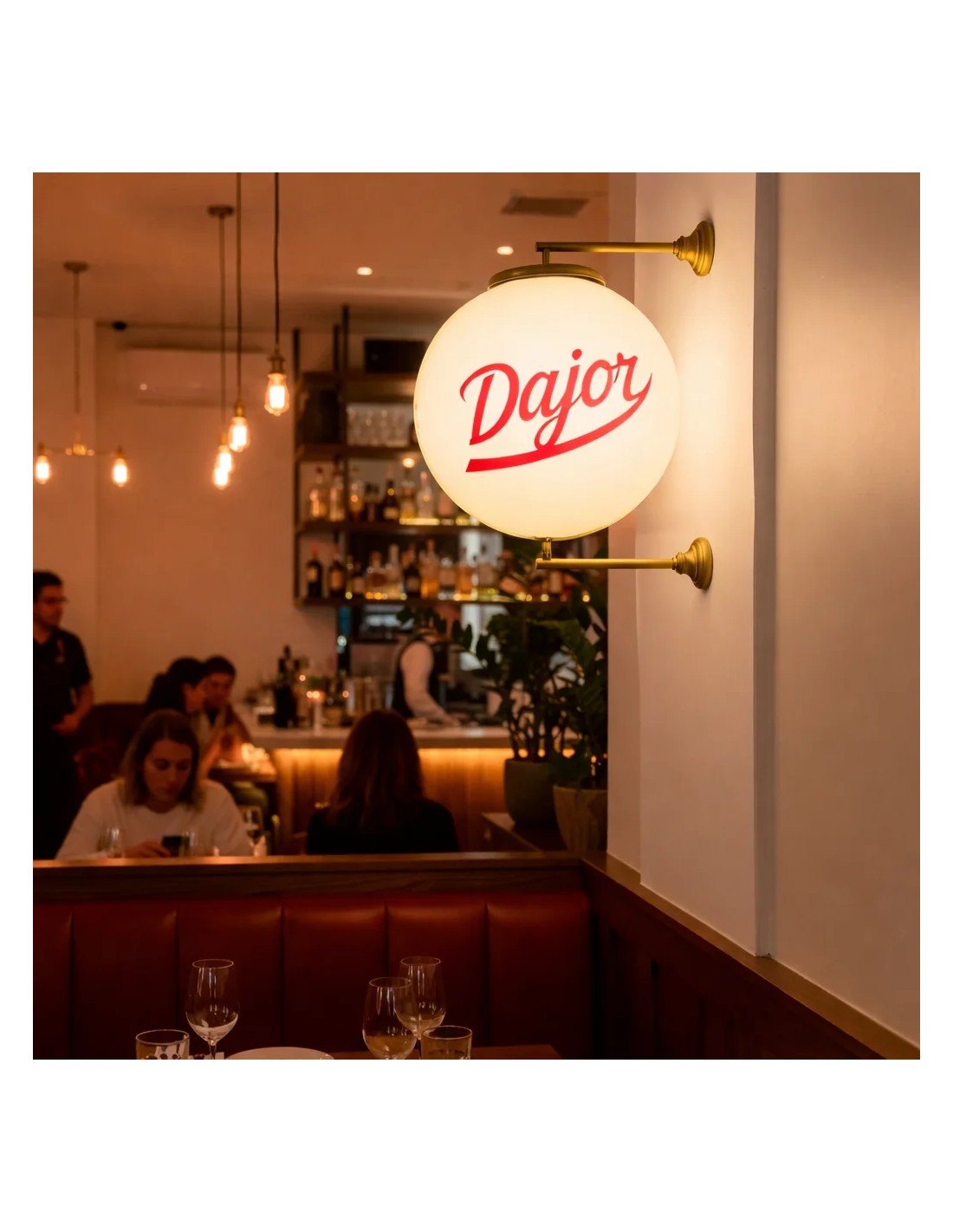 El rótulo luminoso de pared personalizado de Luz Vintage es una pieza única diseñada para señalizar con elegancia y personalidad. Su estructura de latón envejecido combina con un globo esférico de cristal opal, donde se puede incorporar el logo, nombre o texto de tu negocio, creando un punto visual atractivo y sofisticado.