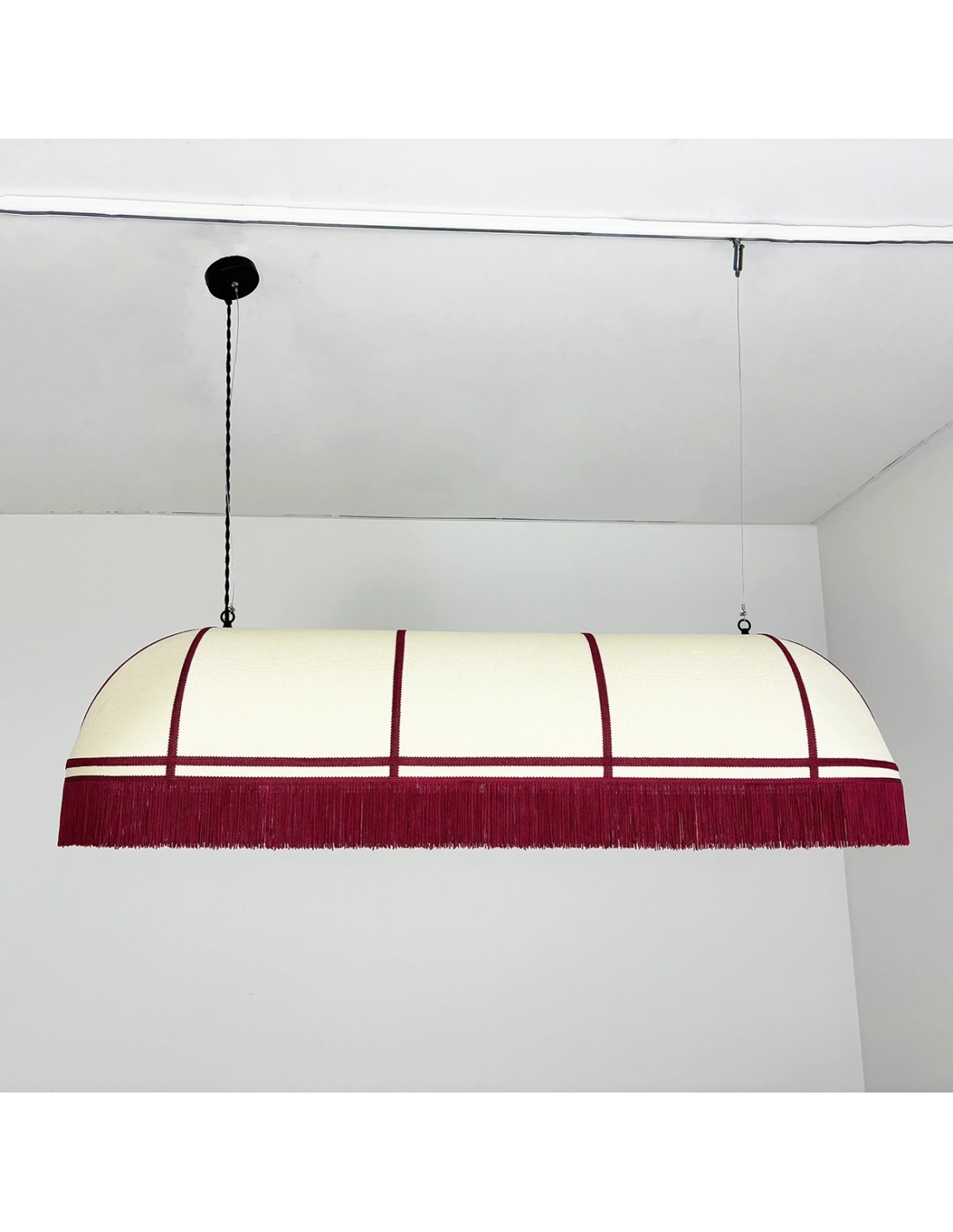La lámpara colgante Ora es una pieza única diseñada para aportar calidez, sofisticación y un toque teatral a cualquier espacio. Fabricada artesanalmente en tela de arpillera beige con detalles estructurales en cinta granate y un elegante faldón de flecos burdeos, esta luminaria combina lo mejor del estilo retro, mid-century y art déco contemporáneo.