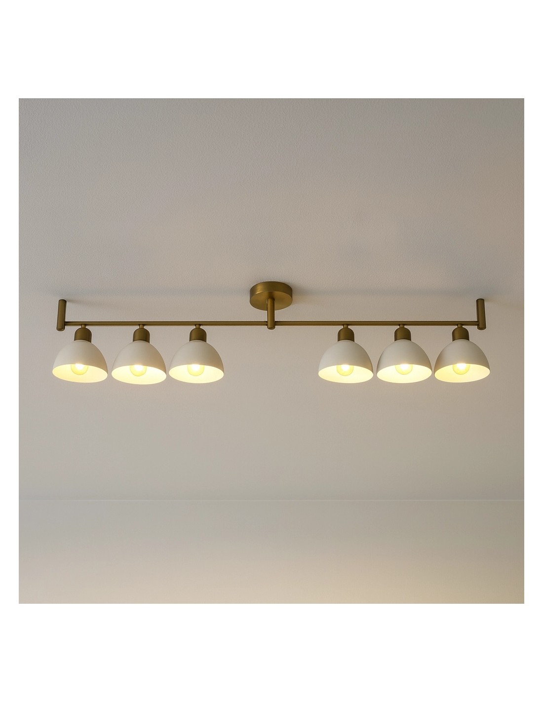 El plafón Sahar es una luminaria decorativa de diseño artesanal que combina latón natural y tulipas de cerámica blanca, creando una pieza elegante, equilibrada y perfecta para iluminar espacios amplios con estilo vintage contemporáneo. Su estructura lineal con seis puntos de luz lo convierte en una lámpara protagonista, ideal para interiores que buscan calidez, diseño y funcionalidad en una sola pieza.