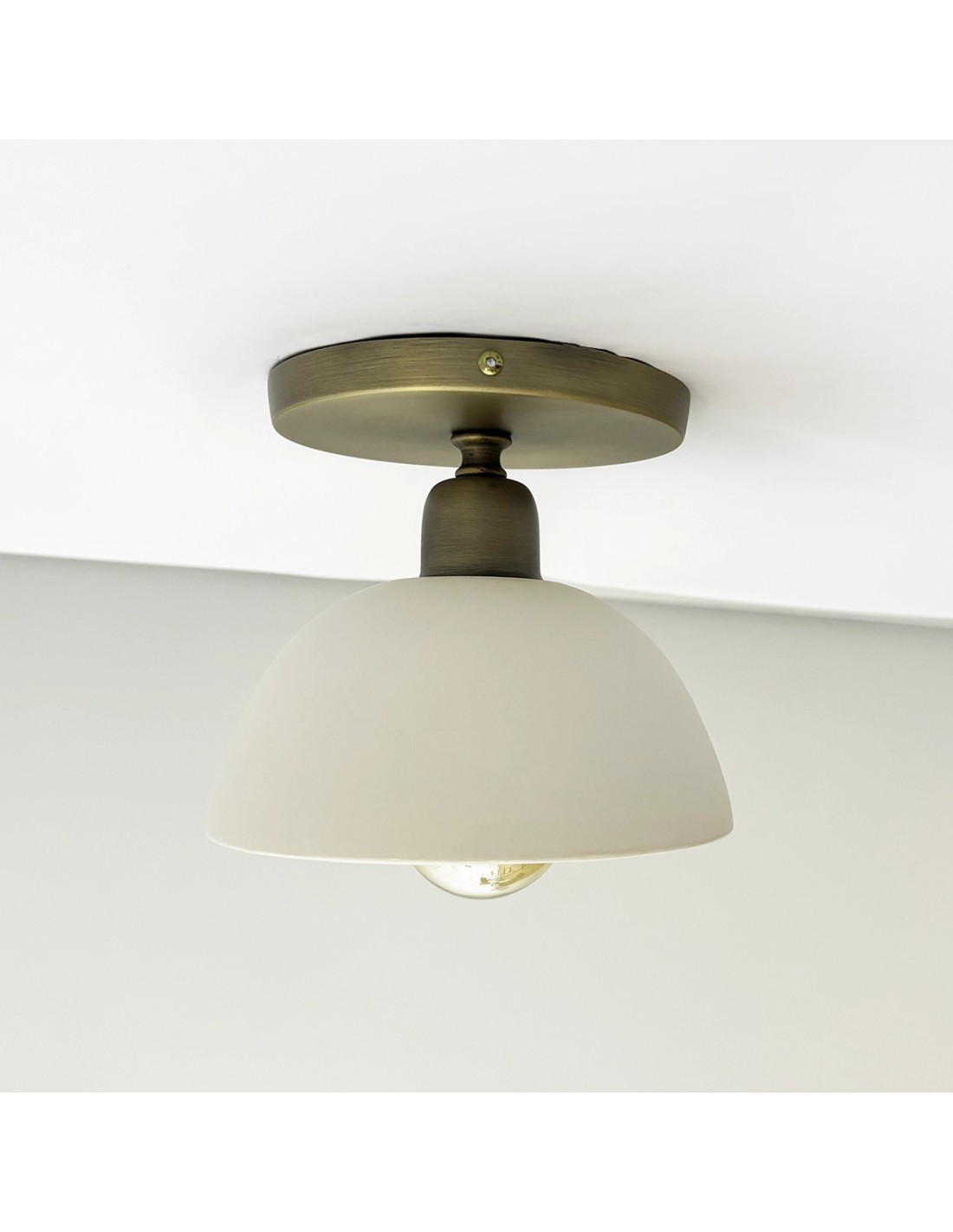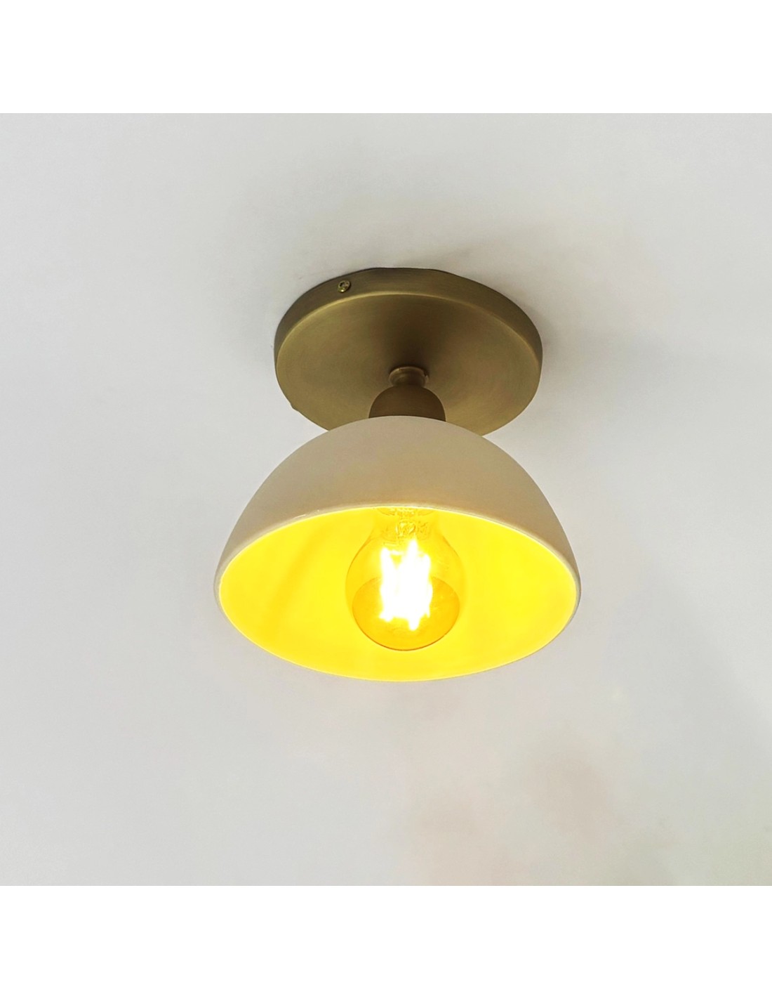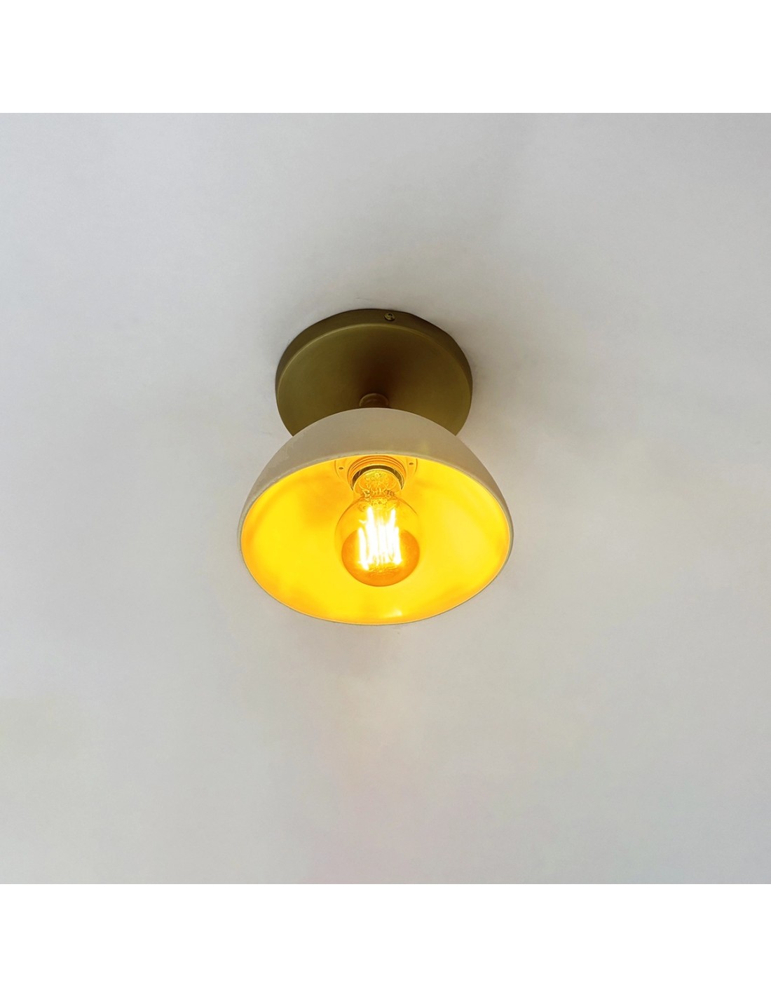El plafón Saiko es una luminaria de estilo vintage–moderno diseñada para aportar una luz cálida, agradable y decorativa en cualquier estancia. Fabricado artesanalmente en metal con baño latonado y una elegante tulipa de cerámica blanca, combina sencillez, sofisticación y un toque retro que encaja en cualquier proyecto de interiorismo.