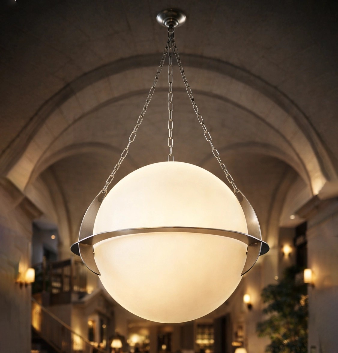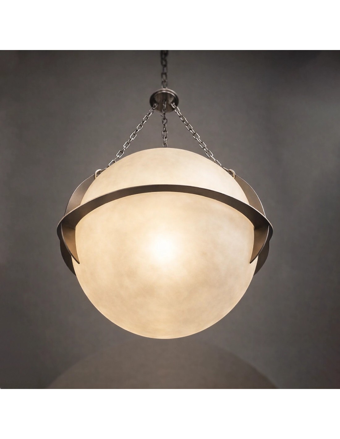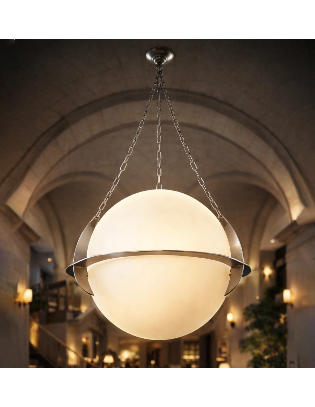 La lámpara colgante Valencia es una luminaria de gran formato que destaca por su diseño elegante, atemporal y rotundo. Está formada por una gran esfera en acrílico de Ø80 cm, suspendida mediante cadenas metálicas regulables en altura, que aportan carácter y un marcado estilo vintage-clásico con guiños monumentales.