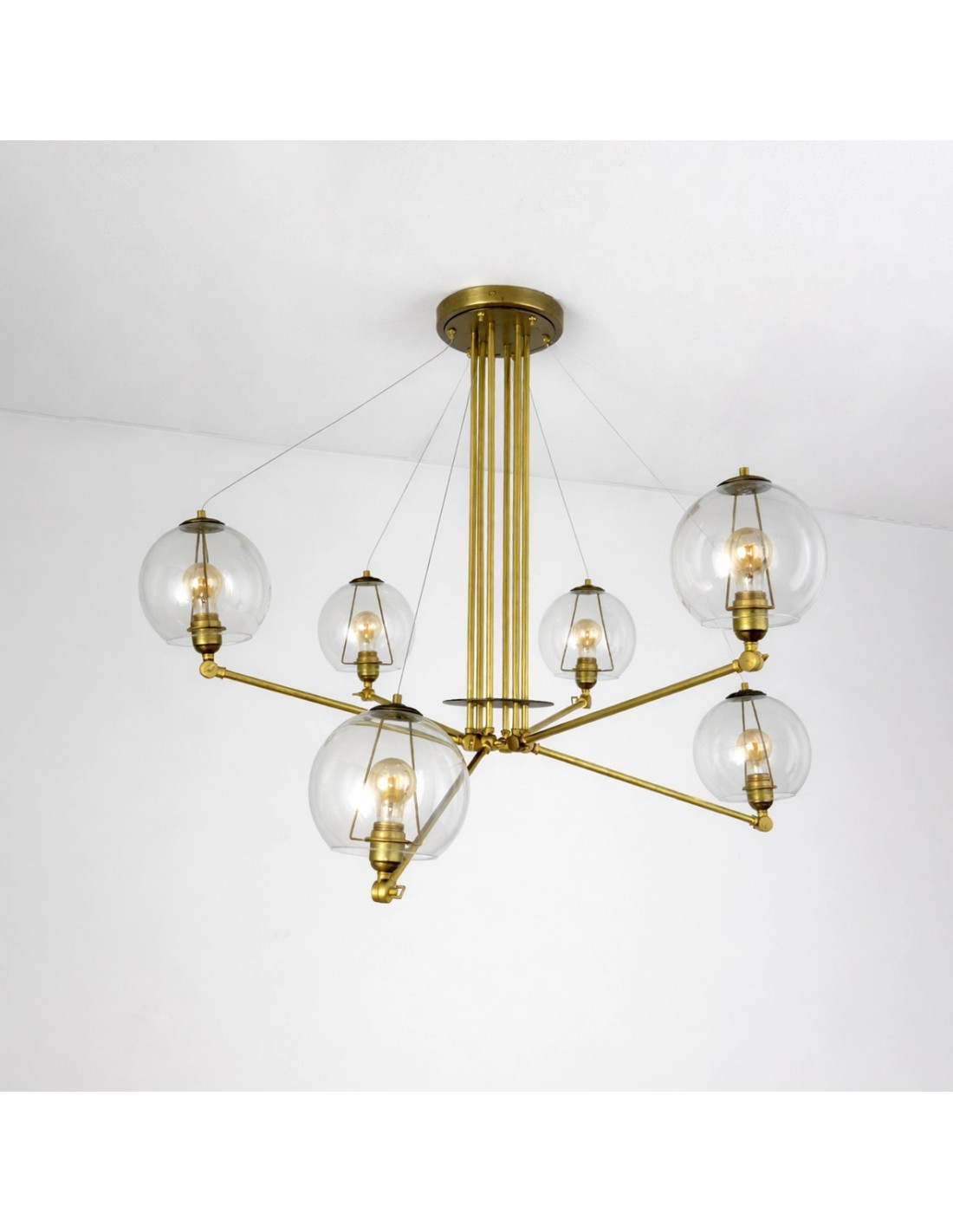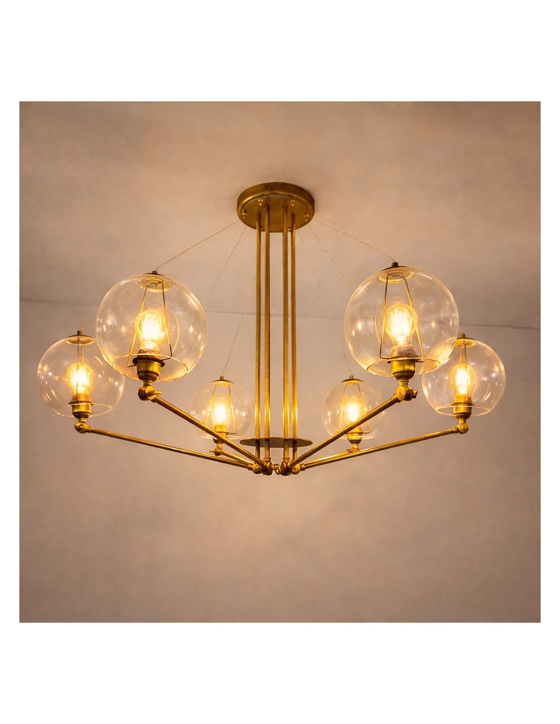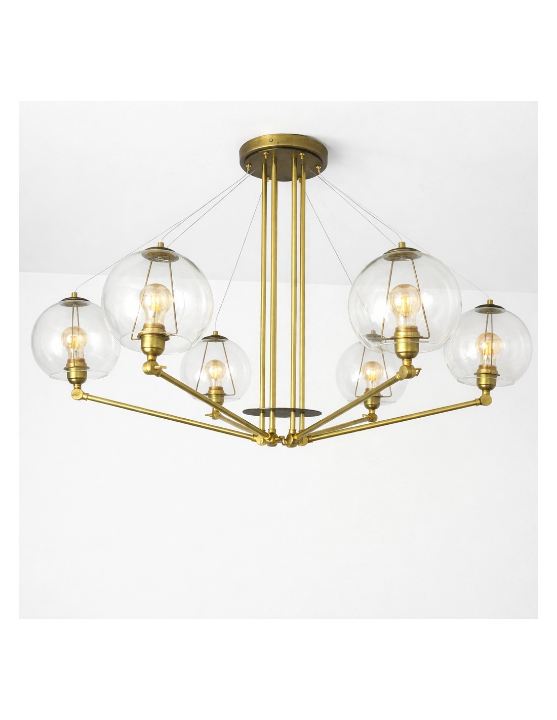 Lámpara colgante de latón con brazos articulados y globos de cristal