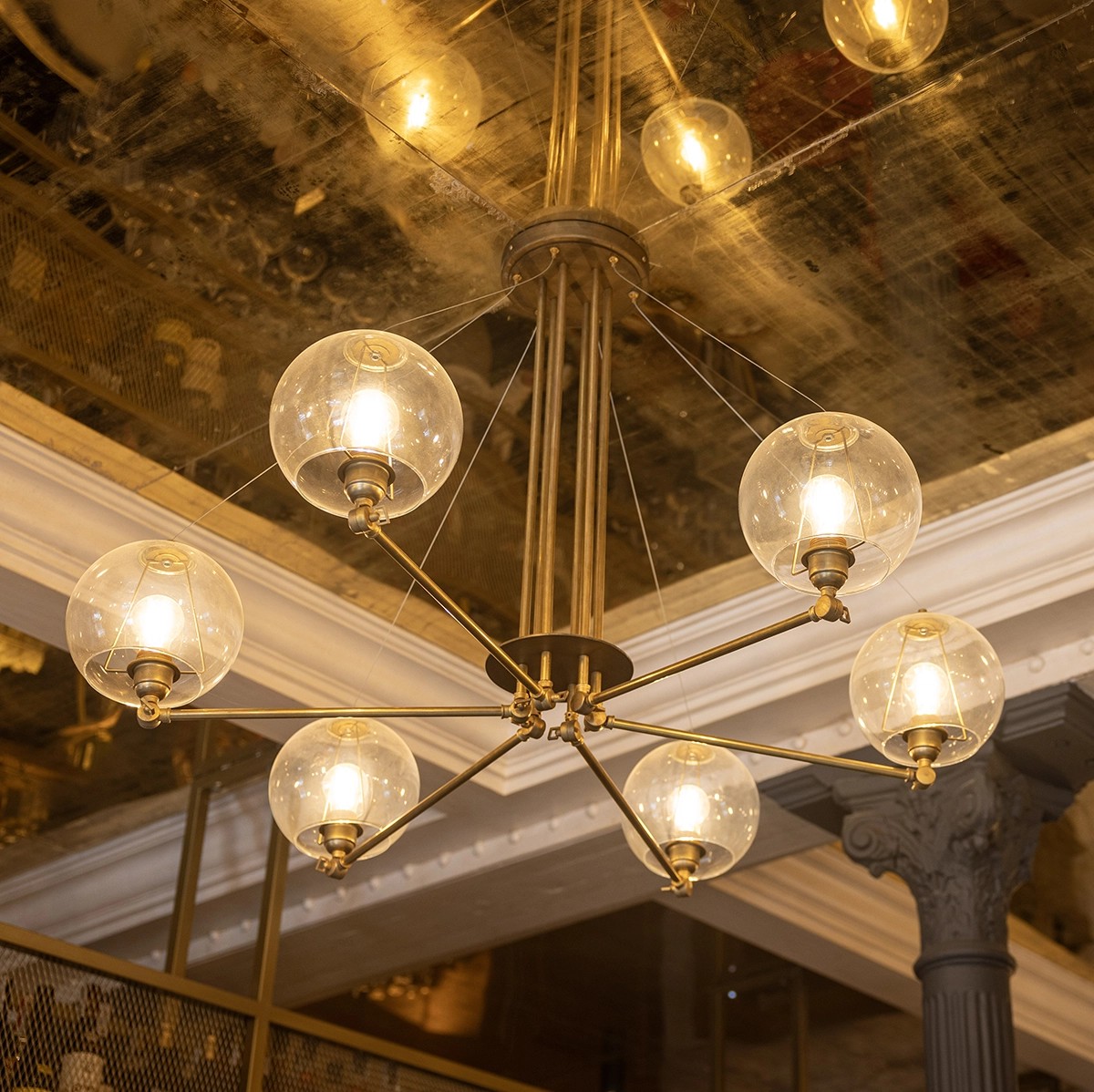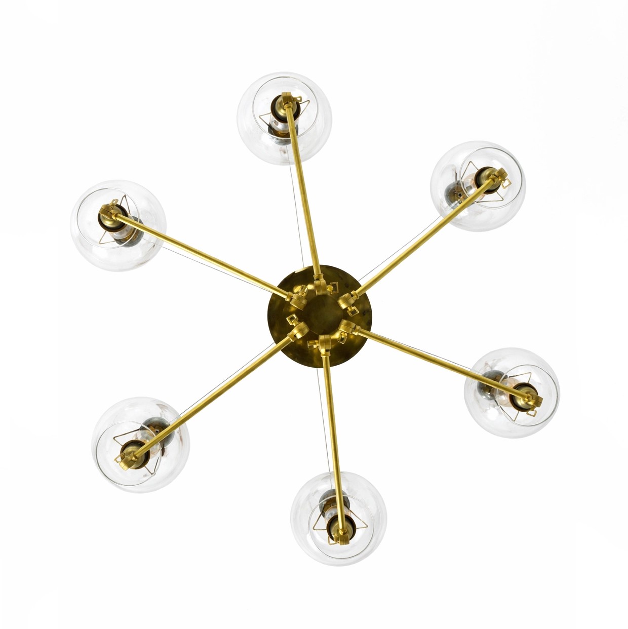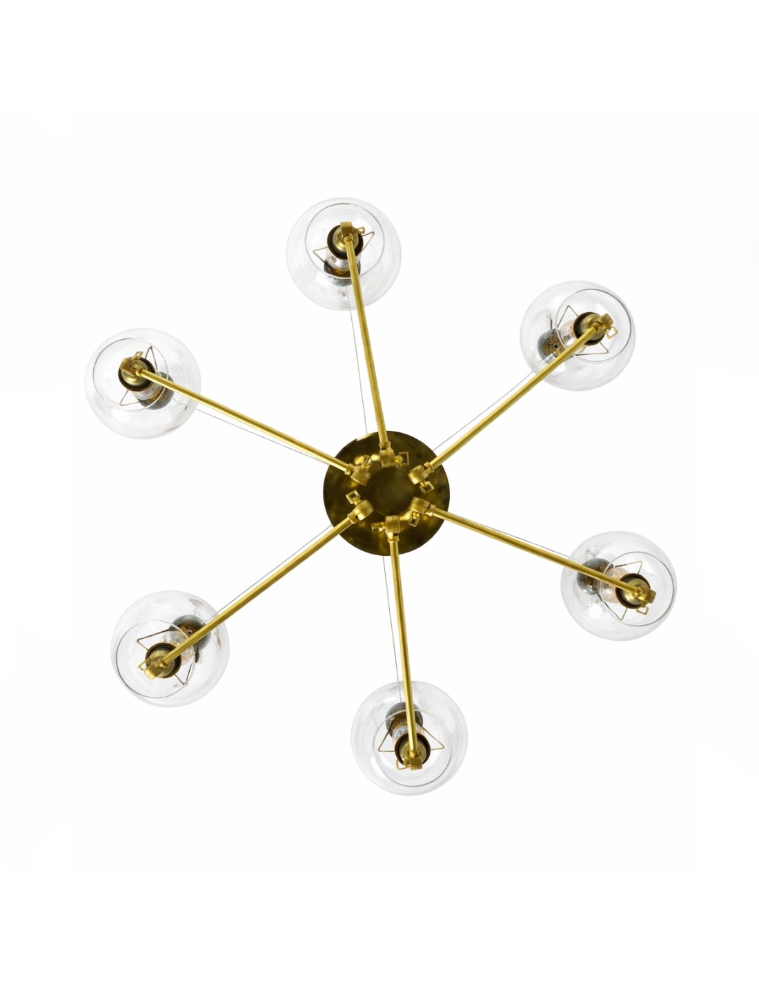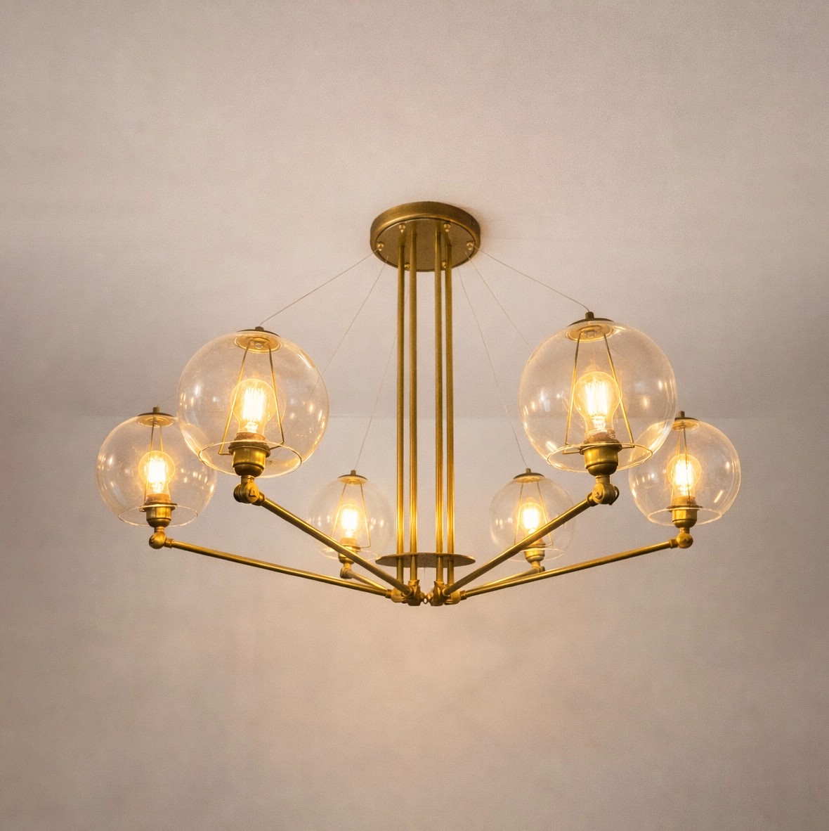 Lámpara colgante de latón con brazos articulados y globos de cristal