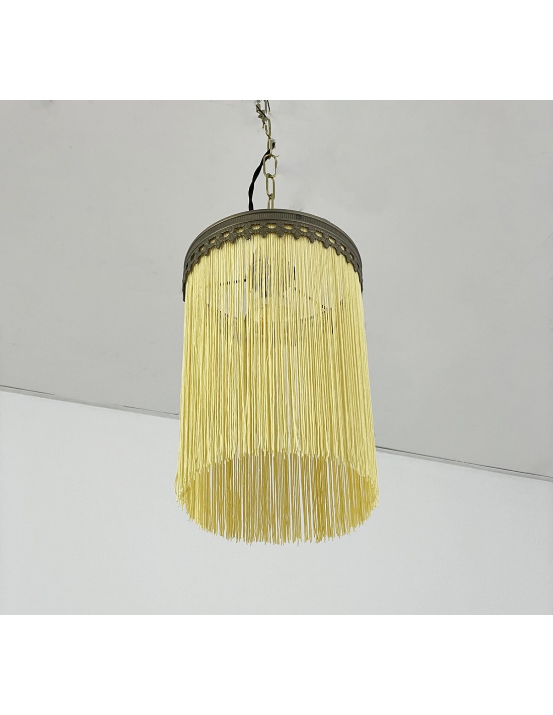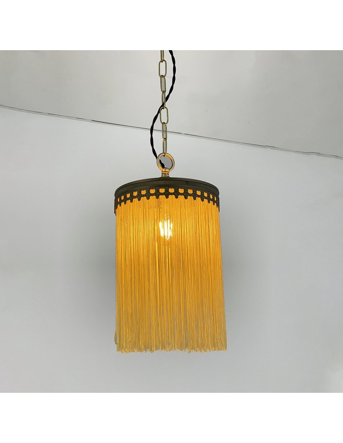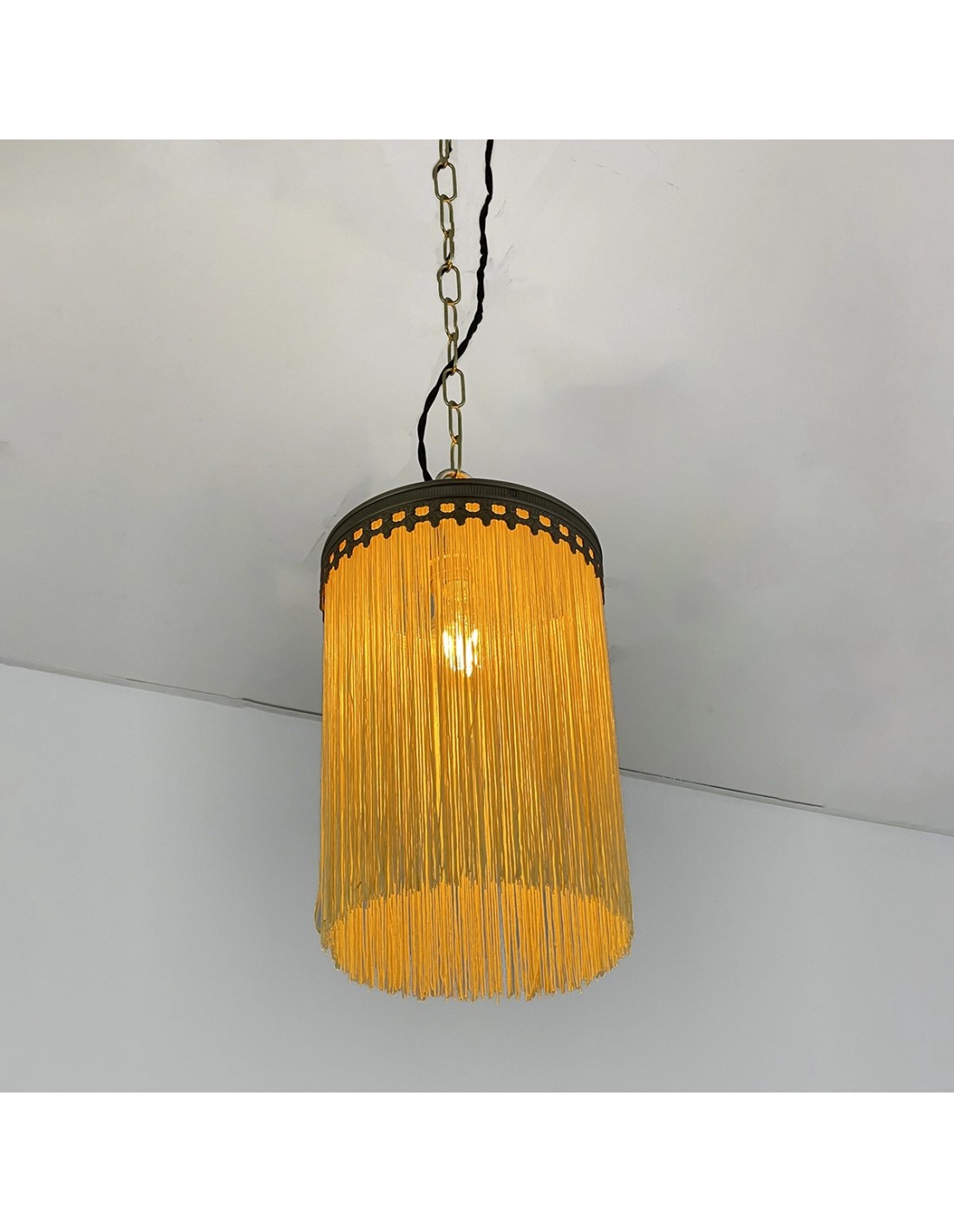 La lámpara colgante vintage Vanda destaca por su diseño elegante y decorativo, compuesto por una estructura metálica en acabado latón envejecido y una pantalla de flecos textiles en tono dorado/mostaza.