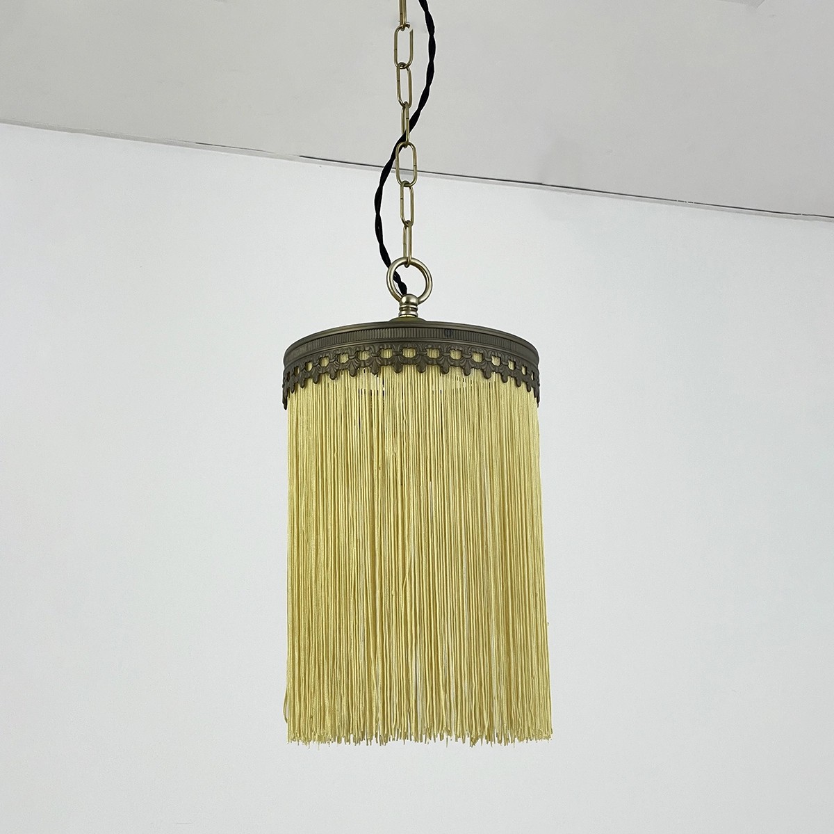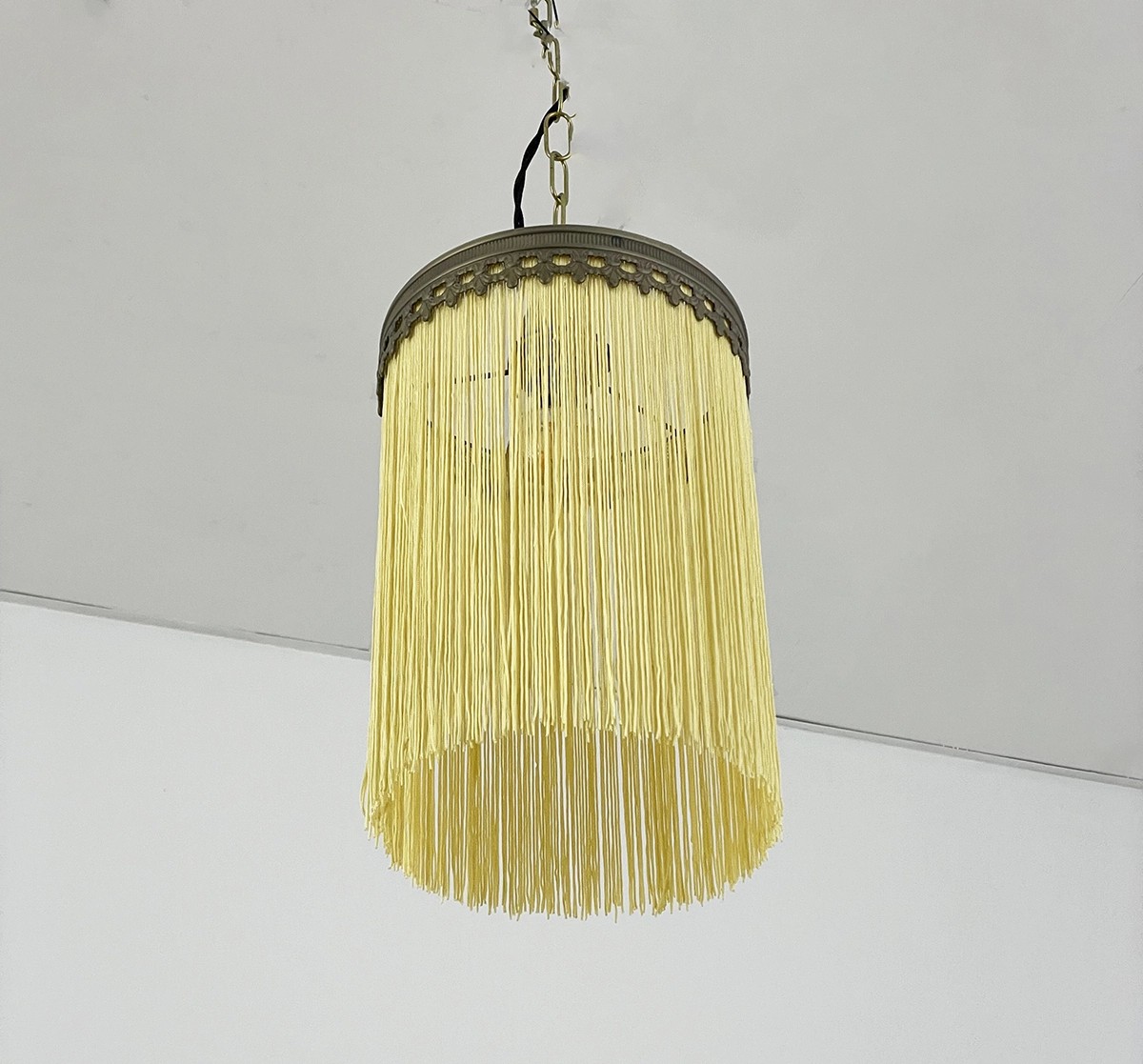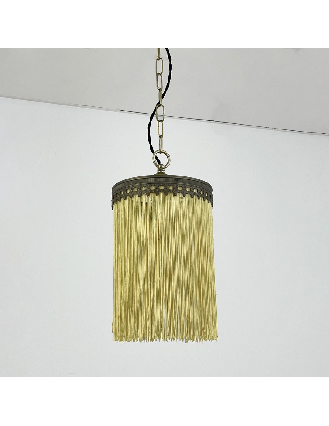 Lámpara colgante vintage Vanda con flecos textiles y acabado latón envejecido
