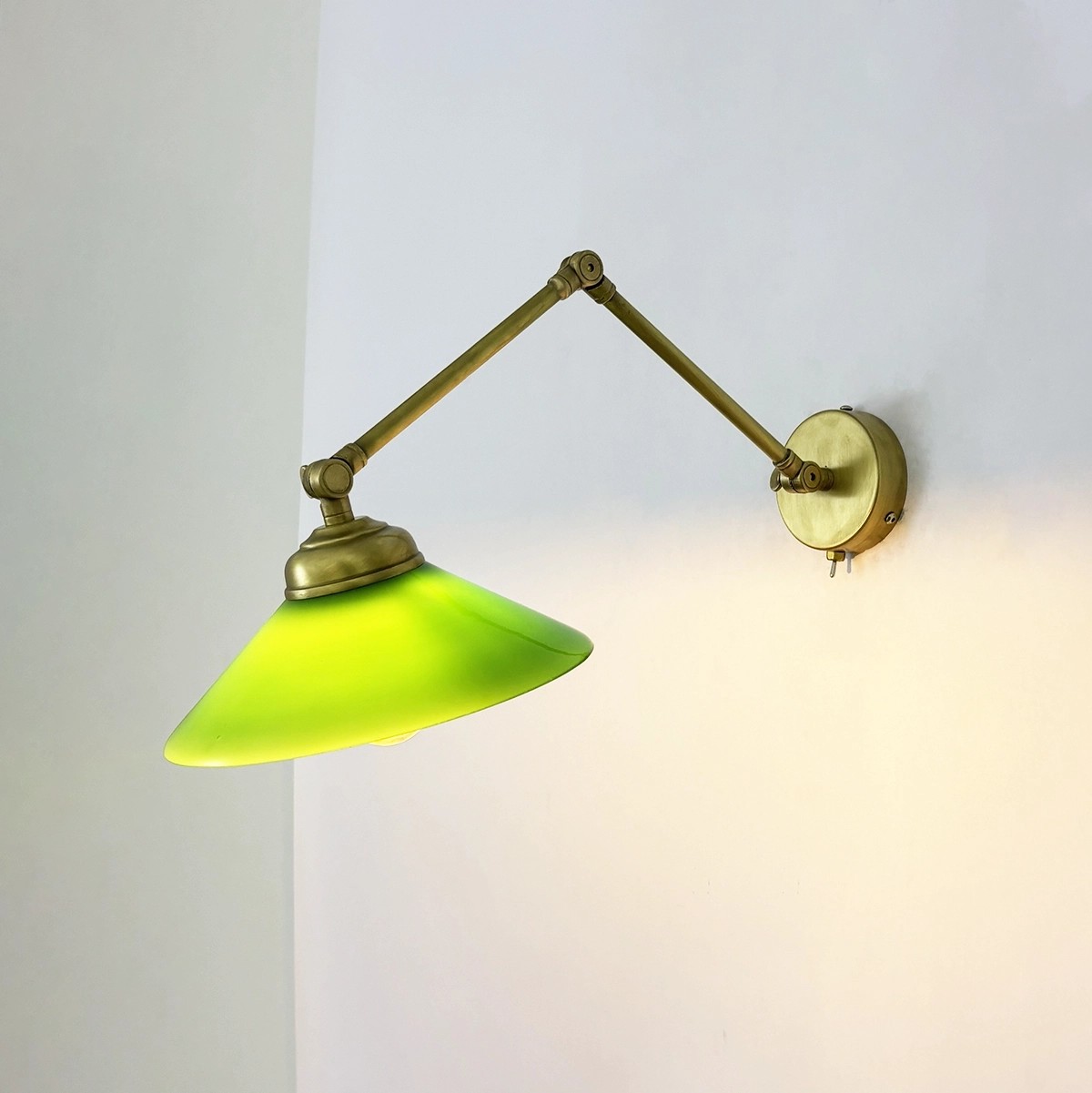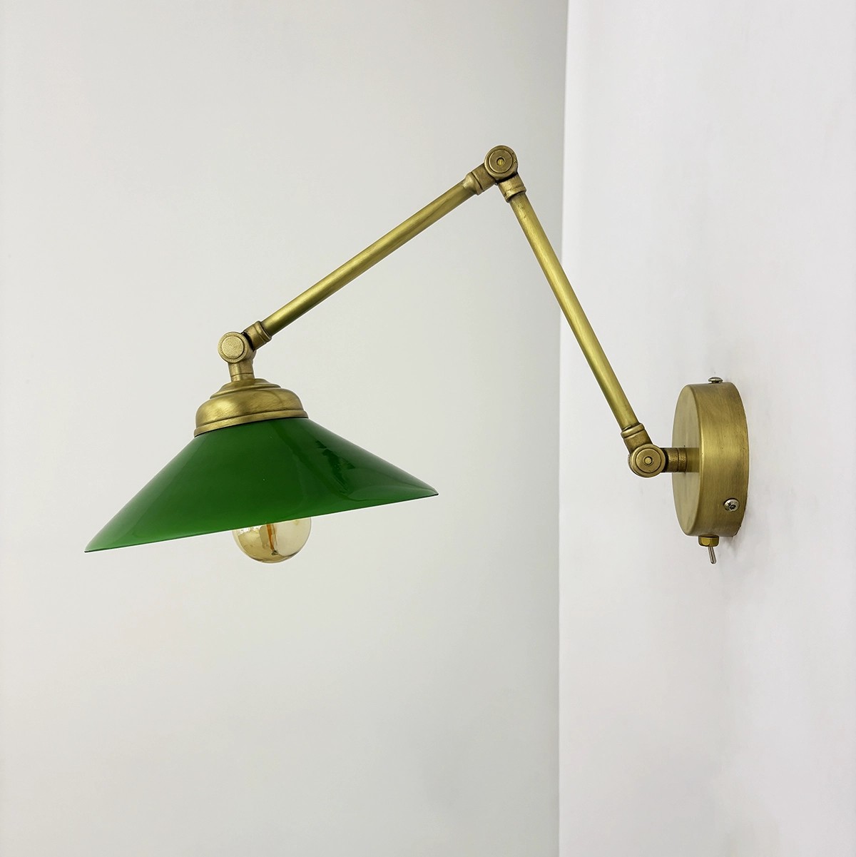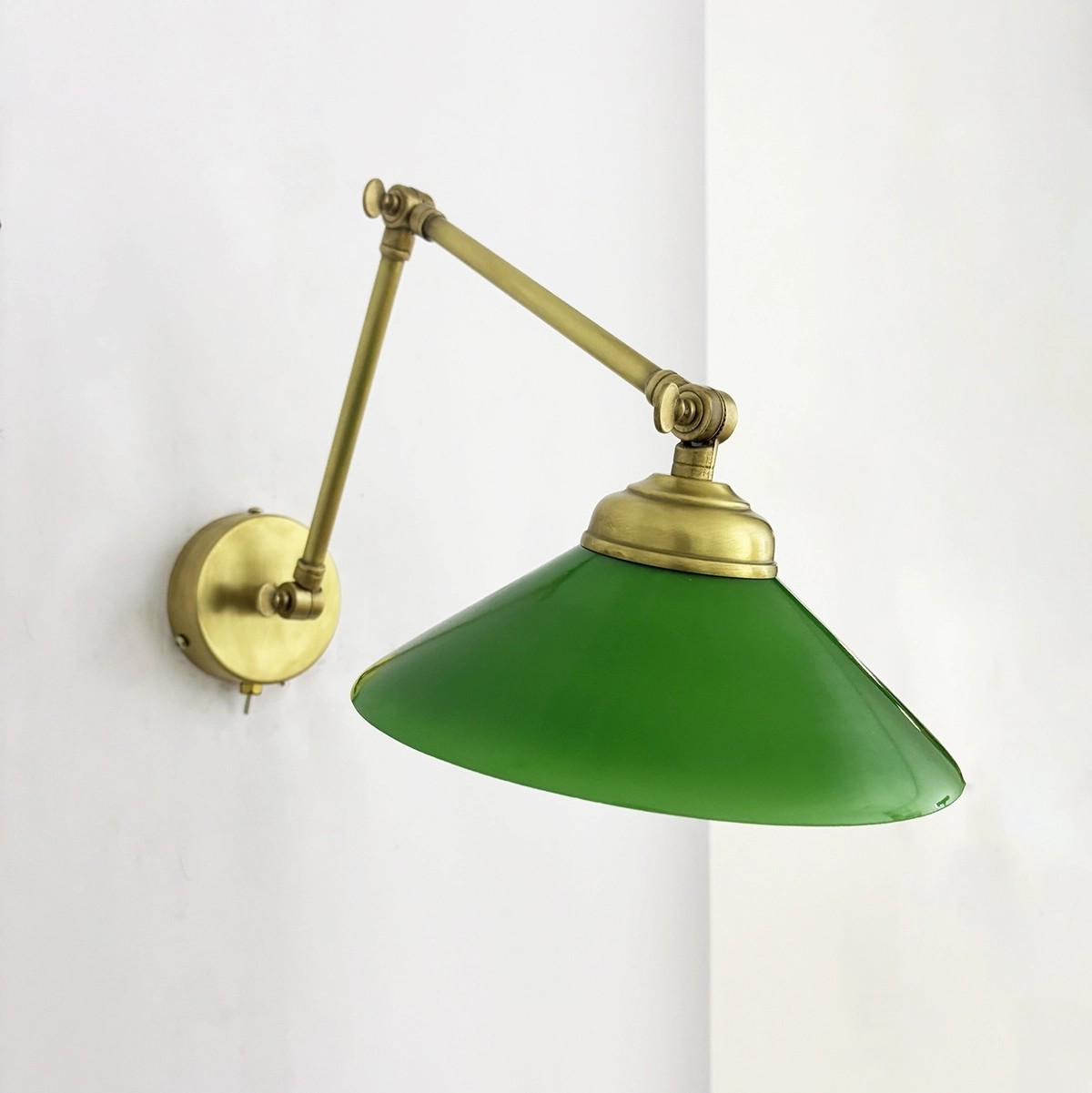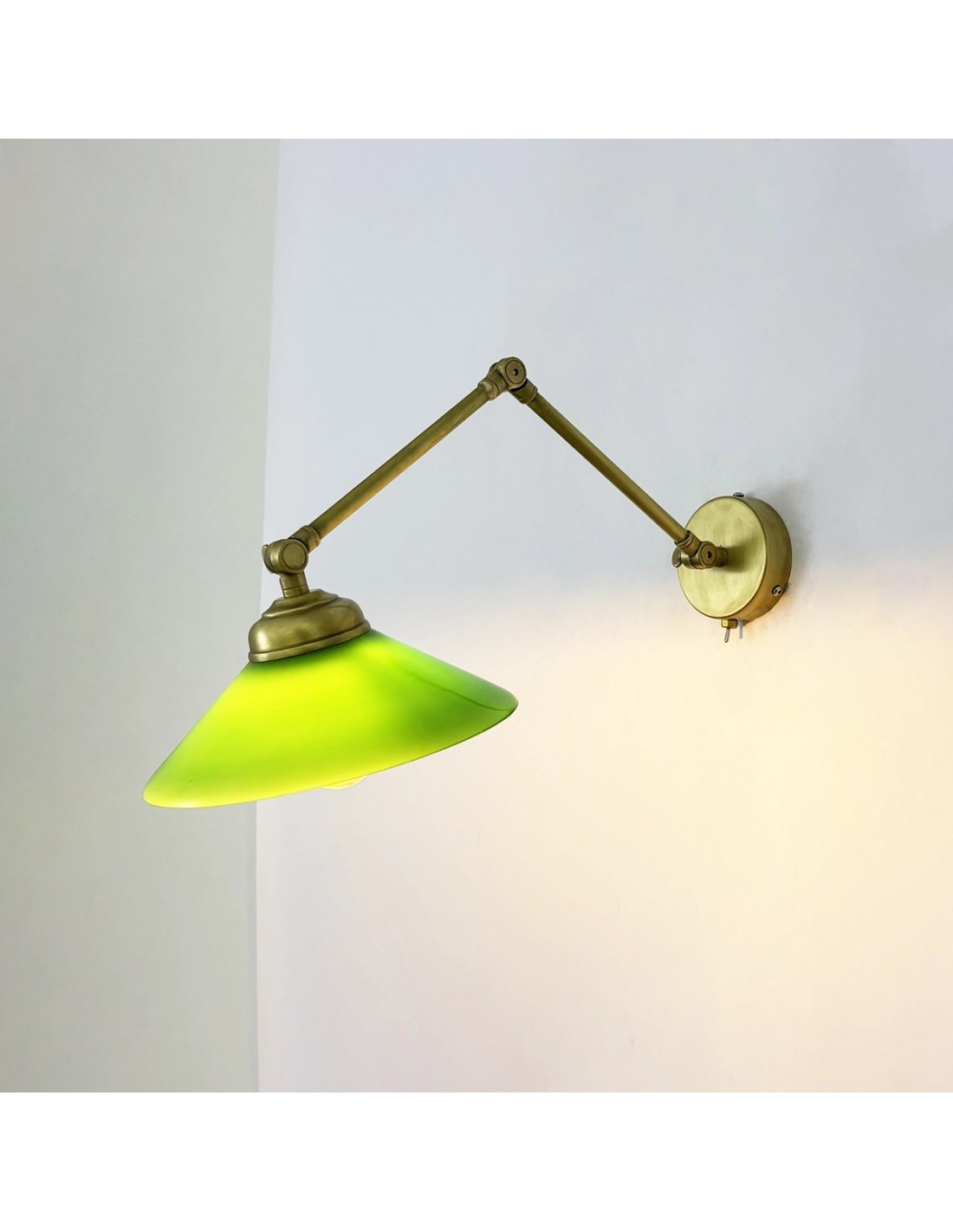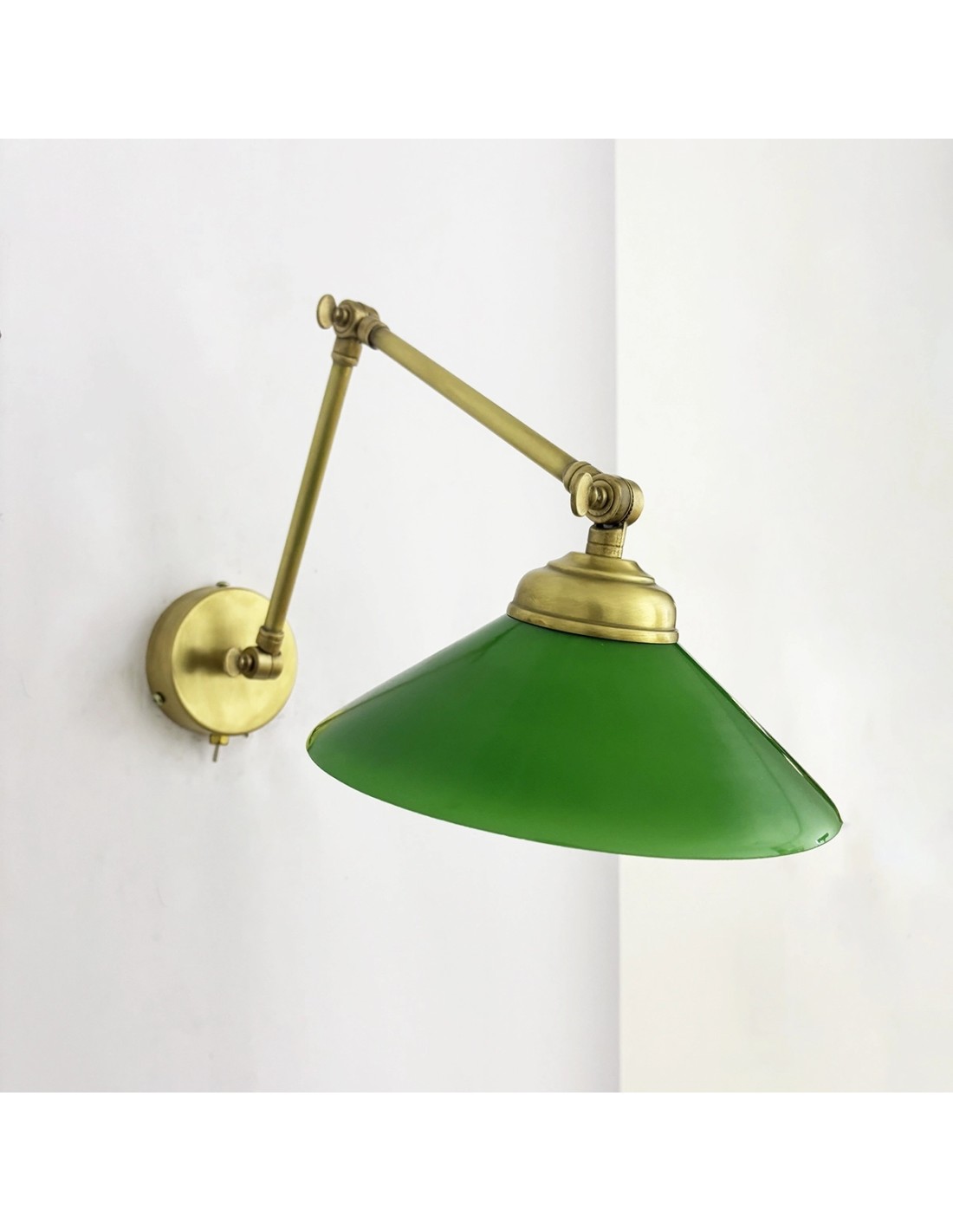 Aplique de pared vintage Doris – Brazos articulados en latón y pantalla de cristal verde