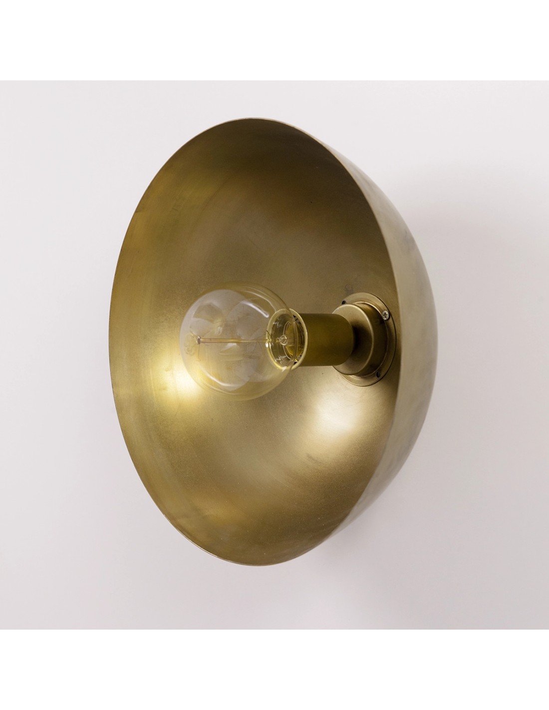 Aidana vintage wall lamp for indoor use from the Luz Vintage lamps collection, reference number 01/A051 and EAN-GTIN 8436593095123 of national production made with handcrafted materials and finishes. The wall lamp has a simple but elegant design and consists of a half metal sphere with an aged brass effect finish. It measures about 35cm in diameter and protrudes 14,5cm from the wall, it is perfect for vintage decorations in restaurants, hotels or casinos. It is powered by an E27 globe-shaped LED bulb with a maximum wattage of 12W and 230V. It produces a very pleasant, elegant warm light. For this luminaire we recommend the vintage LED filament bulb with gold dome to give it a spectacular retro-vintage look, see our bulb catalogue. All vintage lamps from Luz Vintage are powered by LED technology which is more sustainable and efficient than incandescent bulbs. Place this easy to install indoor wall light as a kitchen lamp or living room light. Also as a corridor lamp or as restaurant, hotel and retail lighting or as a bedroom wall lamp, corridor lamp or even as kitchen lighting.