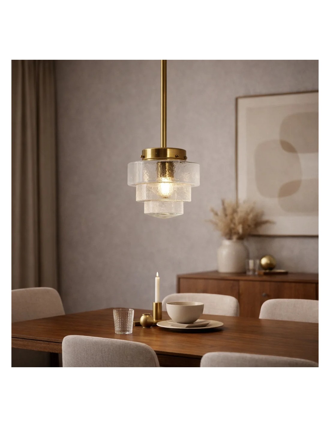 Elian vintage pendant ceiling lamp by Luz Vintage with sku 01/C132 and GTIN 8436593099879, made with a brass effect stem that supports an opal glass lampshade on three hexagonal levels. This easy to install vintage lamp is perfect for vintage and classic decorations where it provides a very elegant and original touch. It can be placed as a bedroom lamp, living room ceiling lamp, dining room lamp... in vintage or classic inspired decorations.