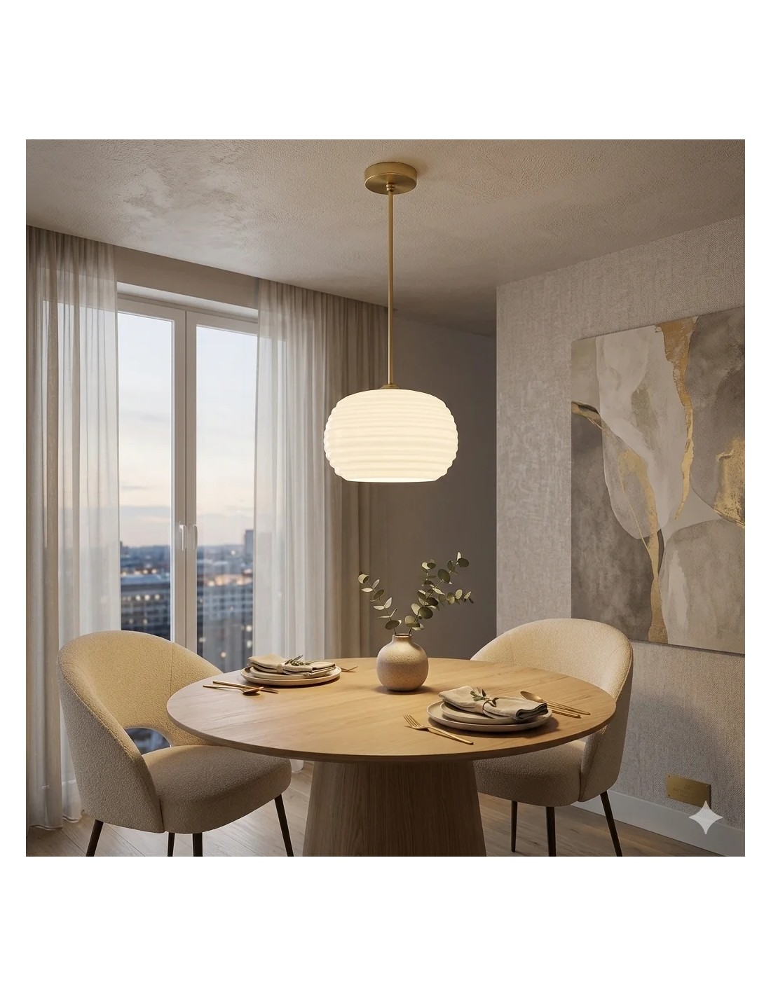 This vintage ceiling light is part of the Eli collection of deco lighting fixtures and has a matching wall light. It is a very elegant lamp with a certain classic touch. It is made up of a golden stem in an aged brass finish and a white opal glass lampshade in the shape of a honeycomb. It produces a soft and warm light ideal for creating comfortable and pleasant atmospheres. It works with an E27 socket LED bulb. All the vintage luminaires in our catalog work with LEDs, which are much more efficient and durable than the usual incandescent light. At Luz Vintage we are specialists in vintage lamps and lighting. Write to info@luzvintage.es to request special conditions for professionals. Consult modifications in the finish and in the measurements of all our vintage lamps. Place this luminaire as a dining room light, living room light, or lighting on a bar counter or kitchen island. It also looks great in vintage, classic or deco-inspired venues, restaurants, hotels or shops.