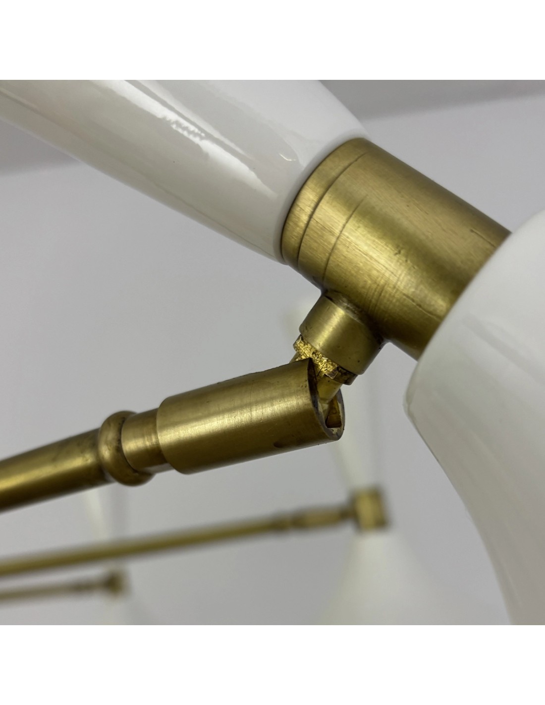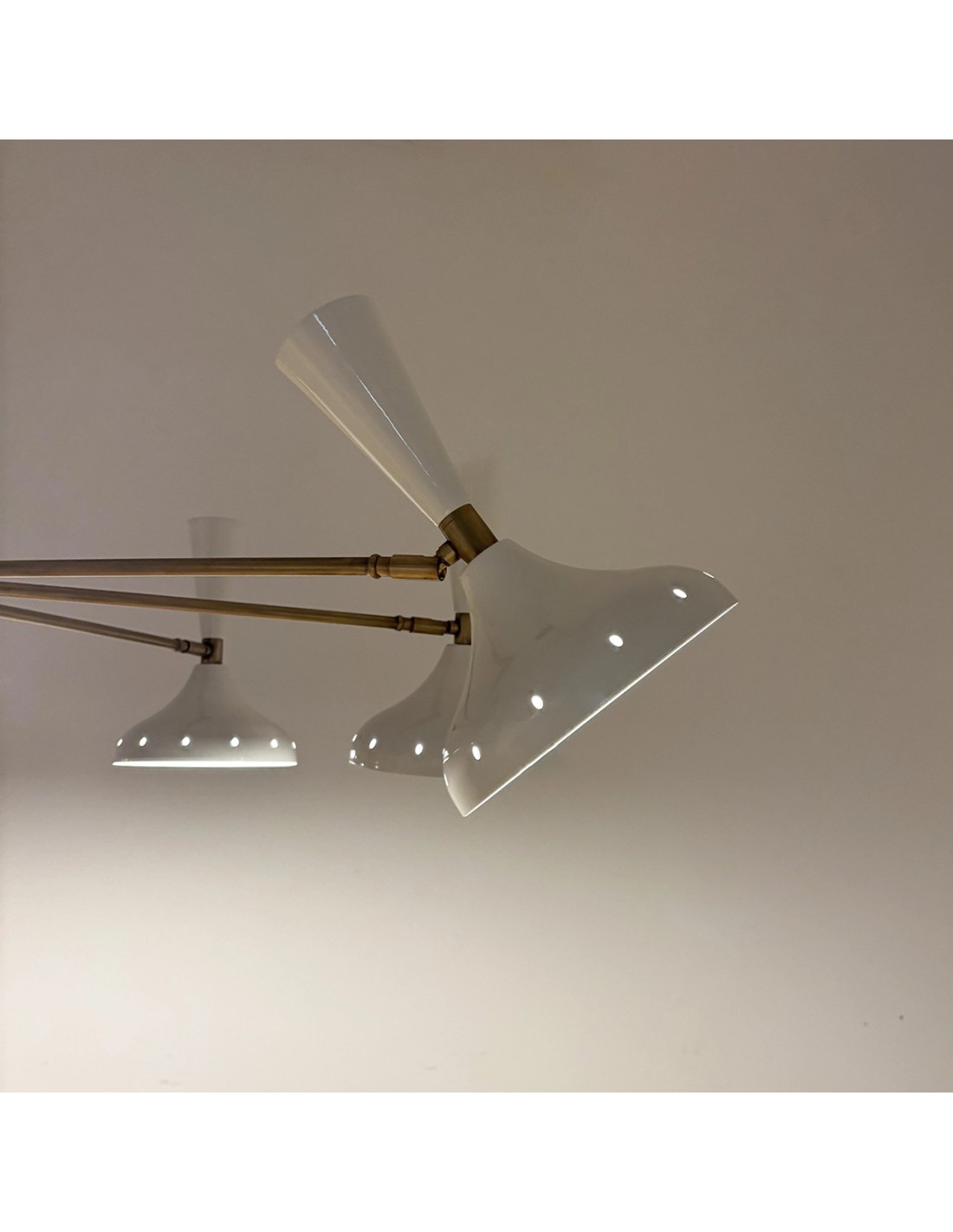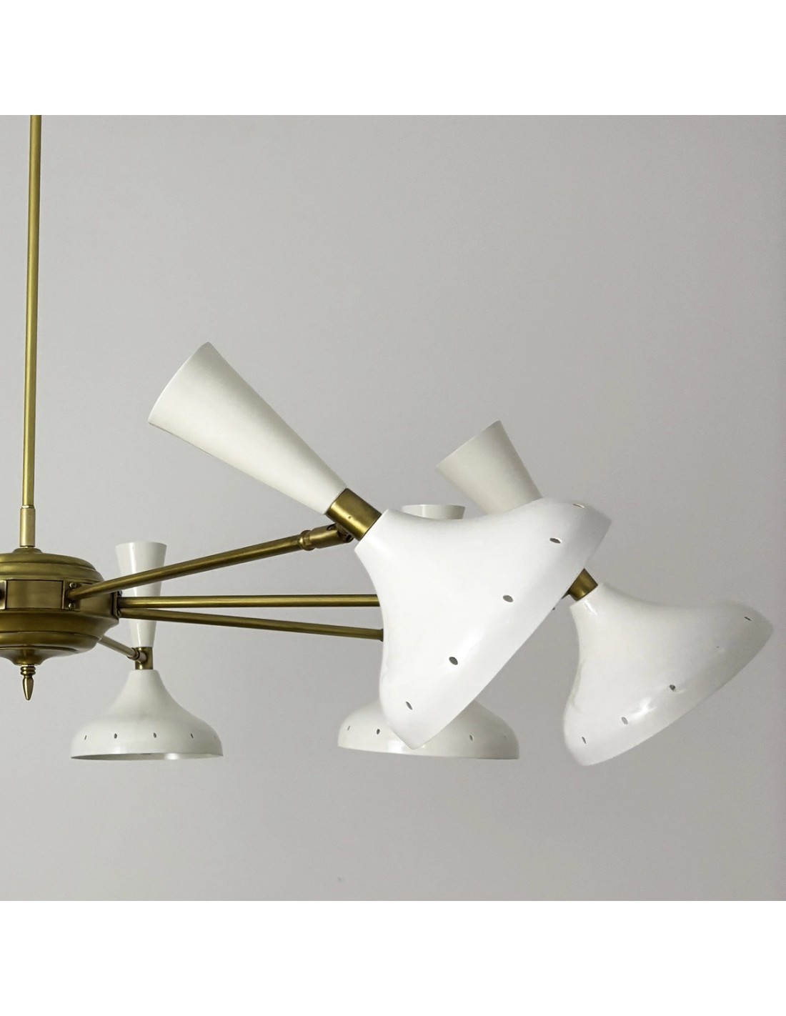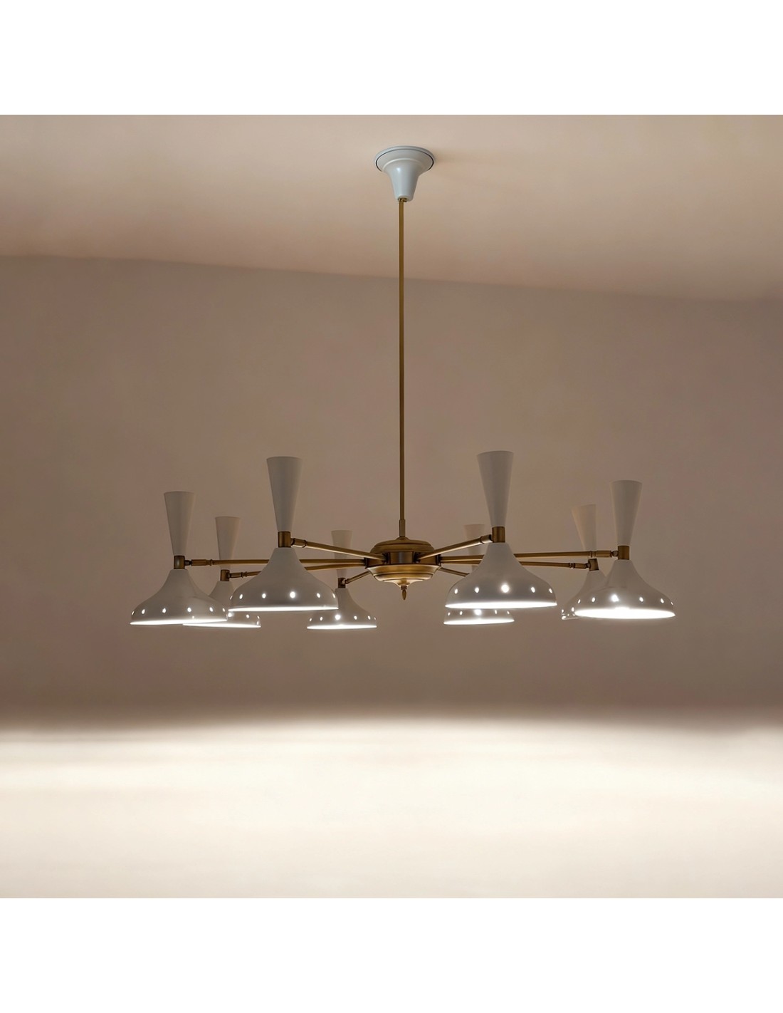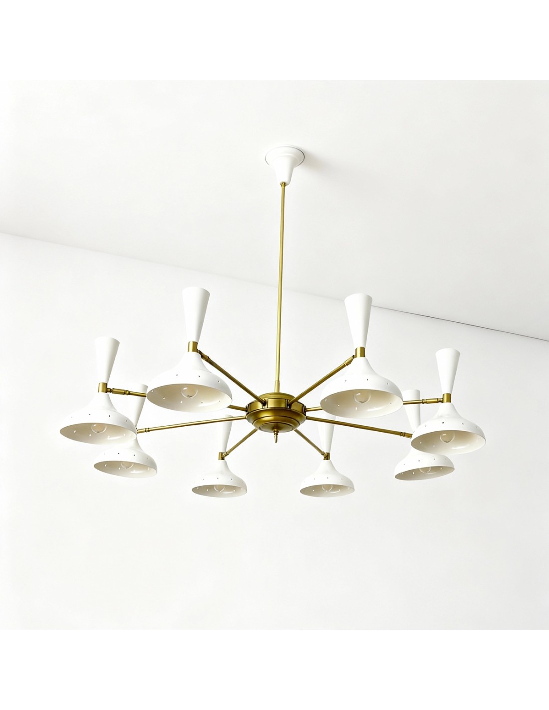 The Uma ceiling lamp is a large-format lighting fixture with a striking presence, perfect for those seeking an iconic design with an artisanal soul. Made of aged brass with eight glossy white lacquered iron domes, its symmetrical and balanced structure stands out for its majestic proportions: Ø120 cm in diameter, with a central rod that can be customised in height to suit the space.