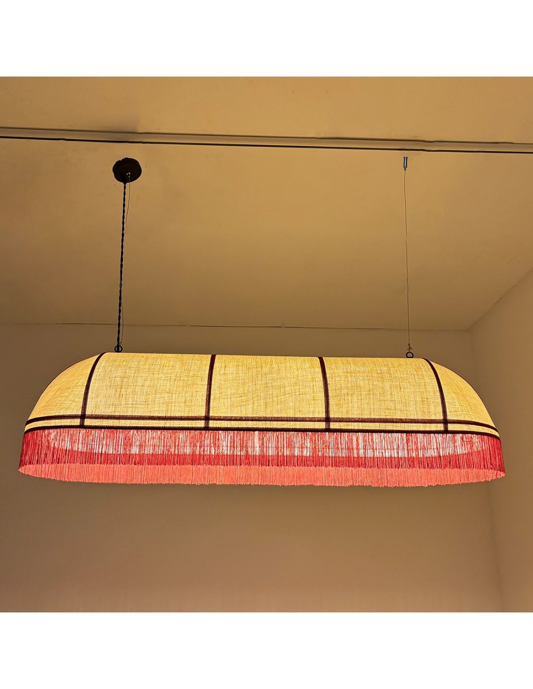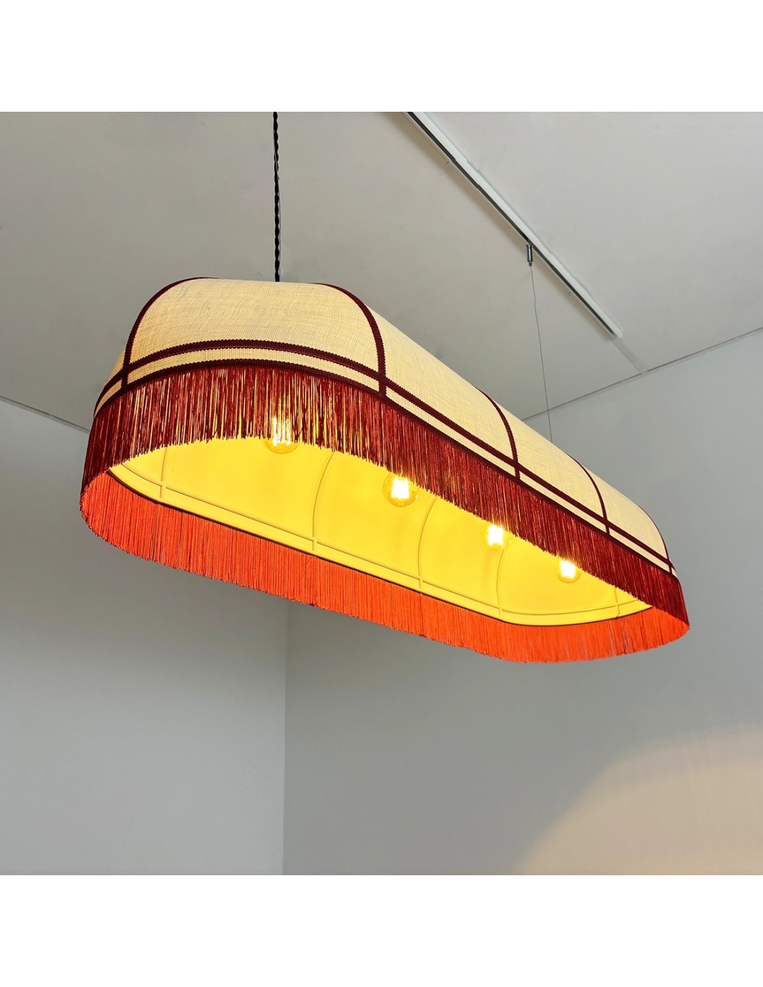 The Ora pendant lamp is a unique piece designed to bring warmth, sophistication and a theatrical touch to any space. Handcrafted in beige burlap fabric with maroon ribbon structural details and an elegant burgundy fringe skirt, this light fixture combines the best of retro, mid-century and contemporary art deco styles.