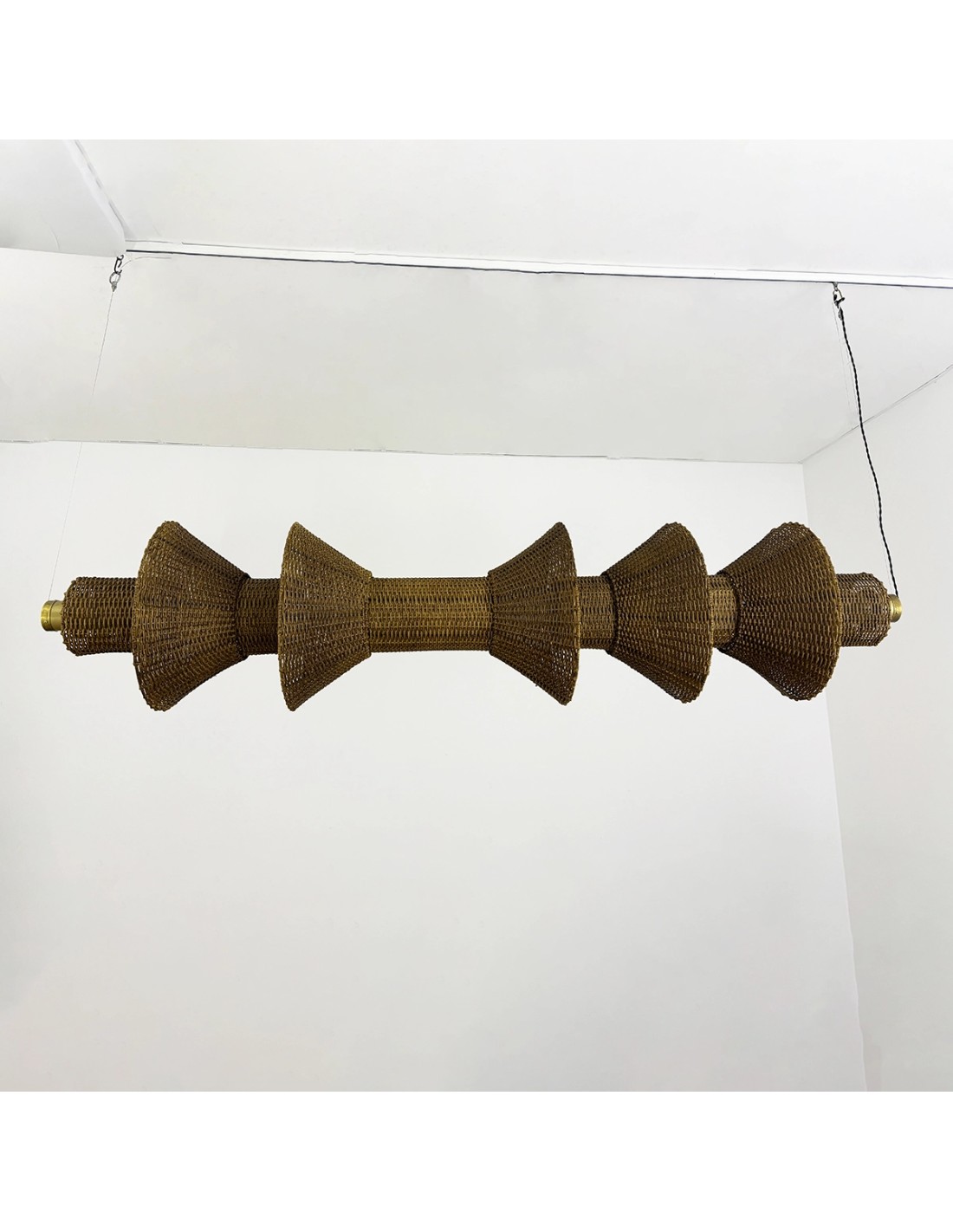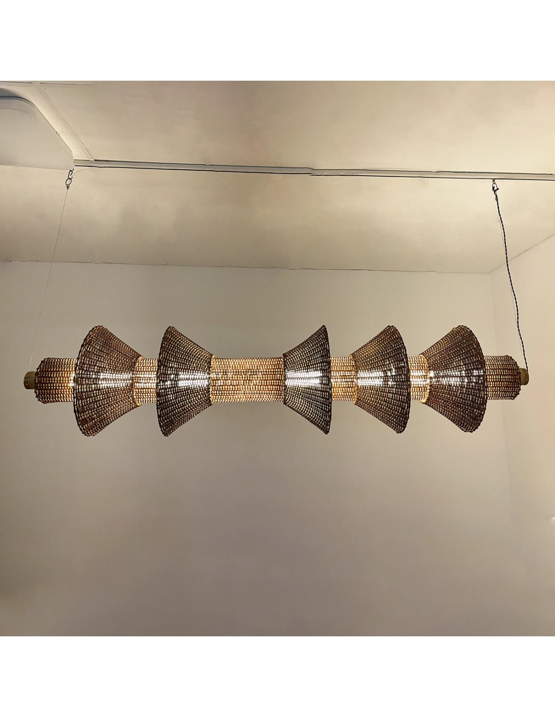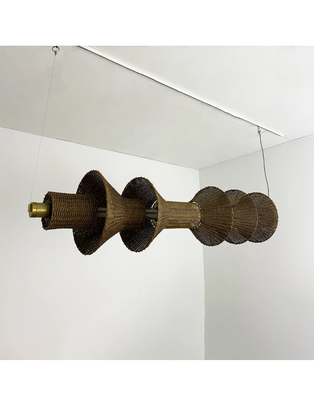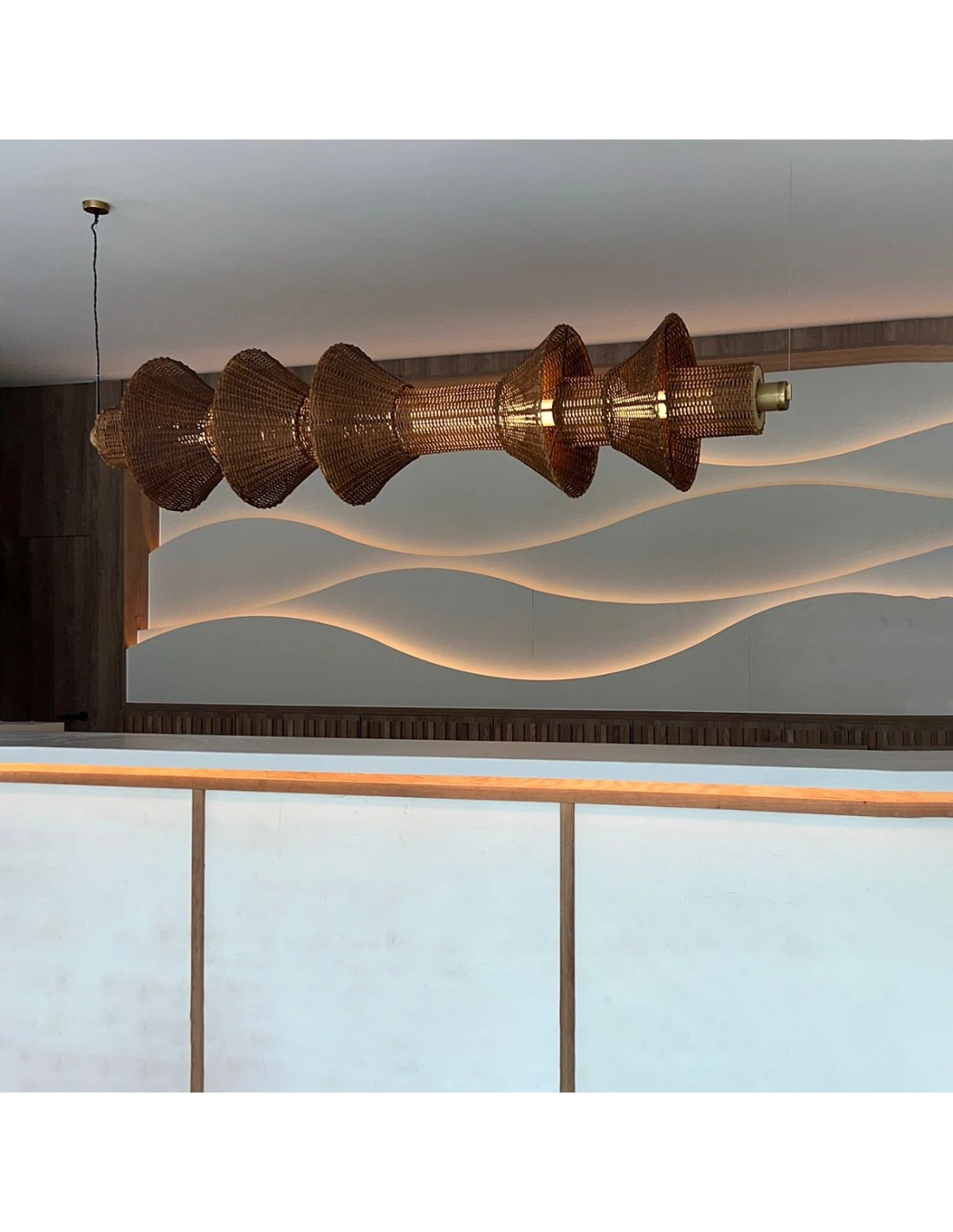 Its elongated, sculptural shape—an impressive 235 cm long—is composed of conical wicker modules that alternate to create an organic and elegant rhythm. A light fixture designed for projects seeking exclusive design and warm ambient lighting, perfect for sophisticated interiors.
