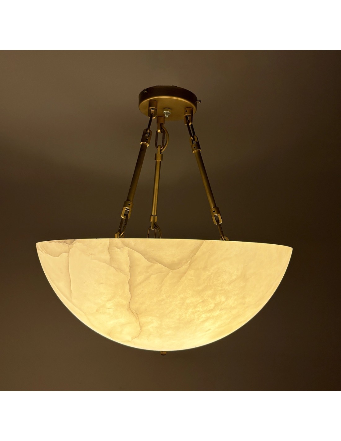 The Saidi ceiling light is a classic-vintage style luminaire made from a spectacular natural alabaster dome combined with aged brass metal braces and trim. Its elegant and timeless design makes this lamp a high-end decorative piece, perfect for projects seeking warm, natural lighting with a touch of sophistication.
