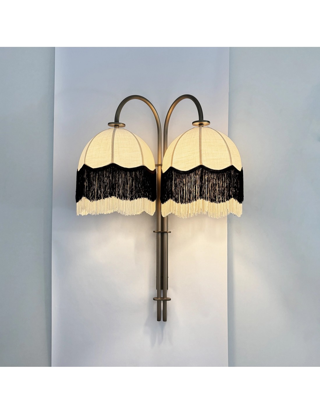 The Valda vintage wall lamp is a large-format luminaire with high decorative impact, designed to become a focal point within the space. It is handcrafted with an aged brass-plated metal structure and two natural linen fabric shades with decorative fringes, which add movement, texture and a sophisticated vintage-art deco feel.