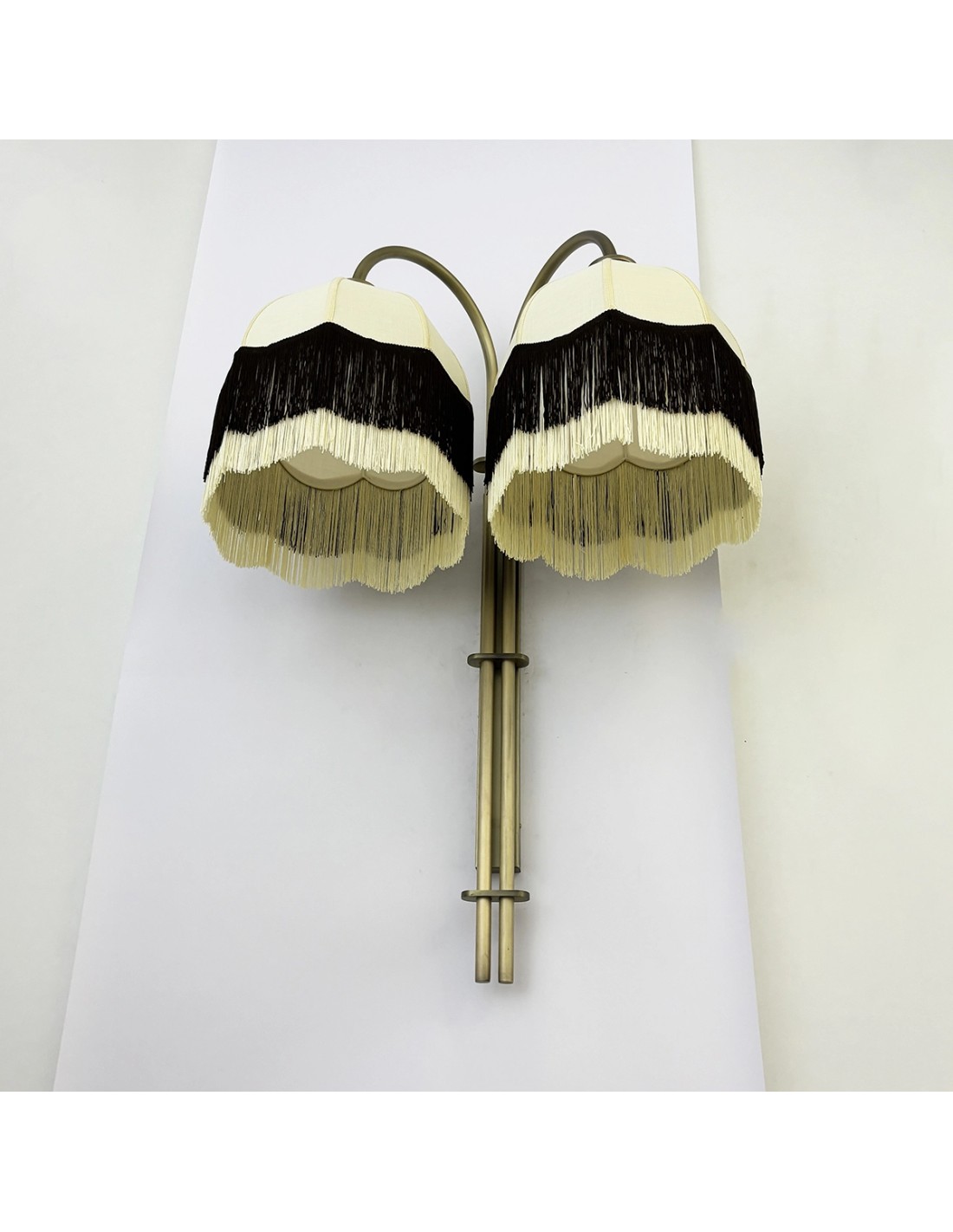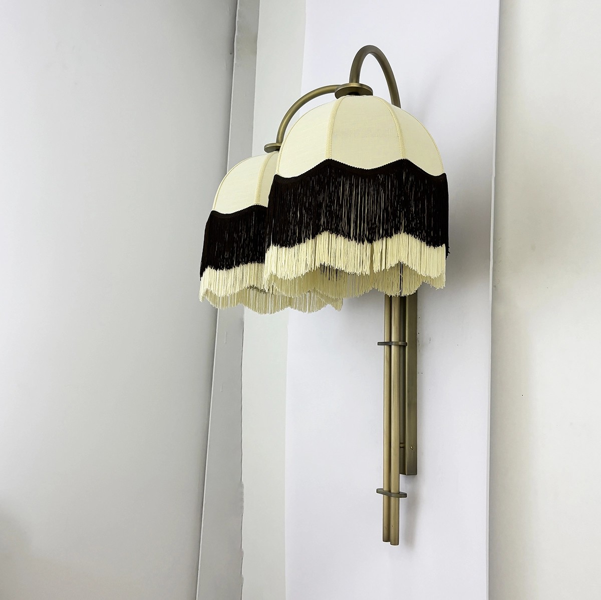 Valda vintage wall light with double linen shade and fringes – Decorative design for contract projects