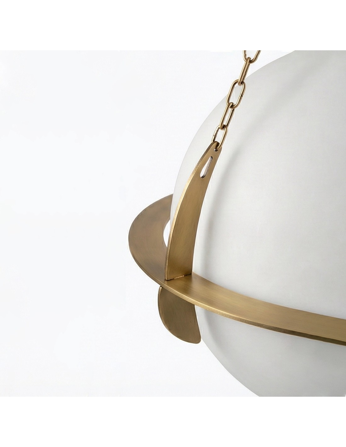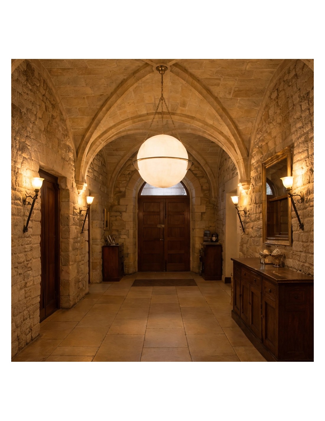 The Valencia pendant lamp is a large-format light fixture that stands out for its elegant, timeless and striking design. It consists of a large acrylic sphere measuring 80 cm in diameter, suspended by height-adjustable metal chains, which lend it character and a marked vintage-classic style with monumental touches.