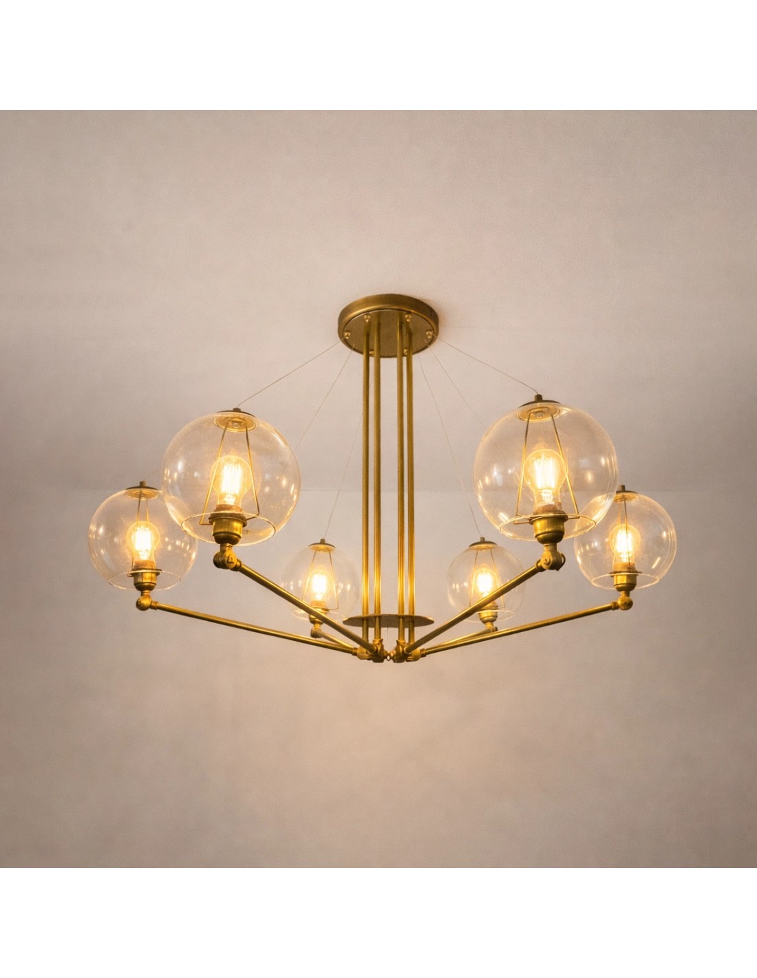 This brass-finished pendant lamp with transparent glass globes stands out for its elegant and balanced design, where the metal structure is combined with the visual lightness of glass. Its timeless aesthetic makes it a decorative piece with character, capable of adding presence without overloading the space.