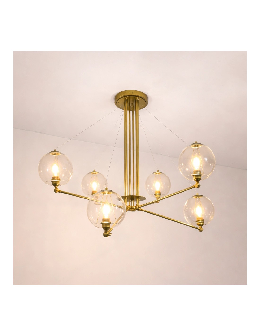 Each of its arms incorporates an articulated ball joint, allowing the light points to be directed and positioned according to the needs of the environment, offering fully customisable lighting. The glass shades leave the bulb exposed, enhancing a warm and enveloping light, ideal for creating cosy atmospheres.