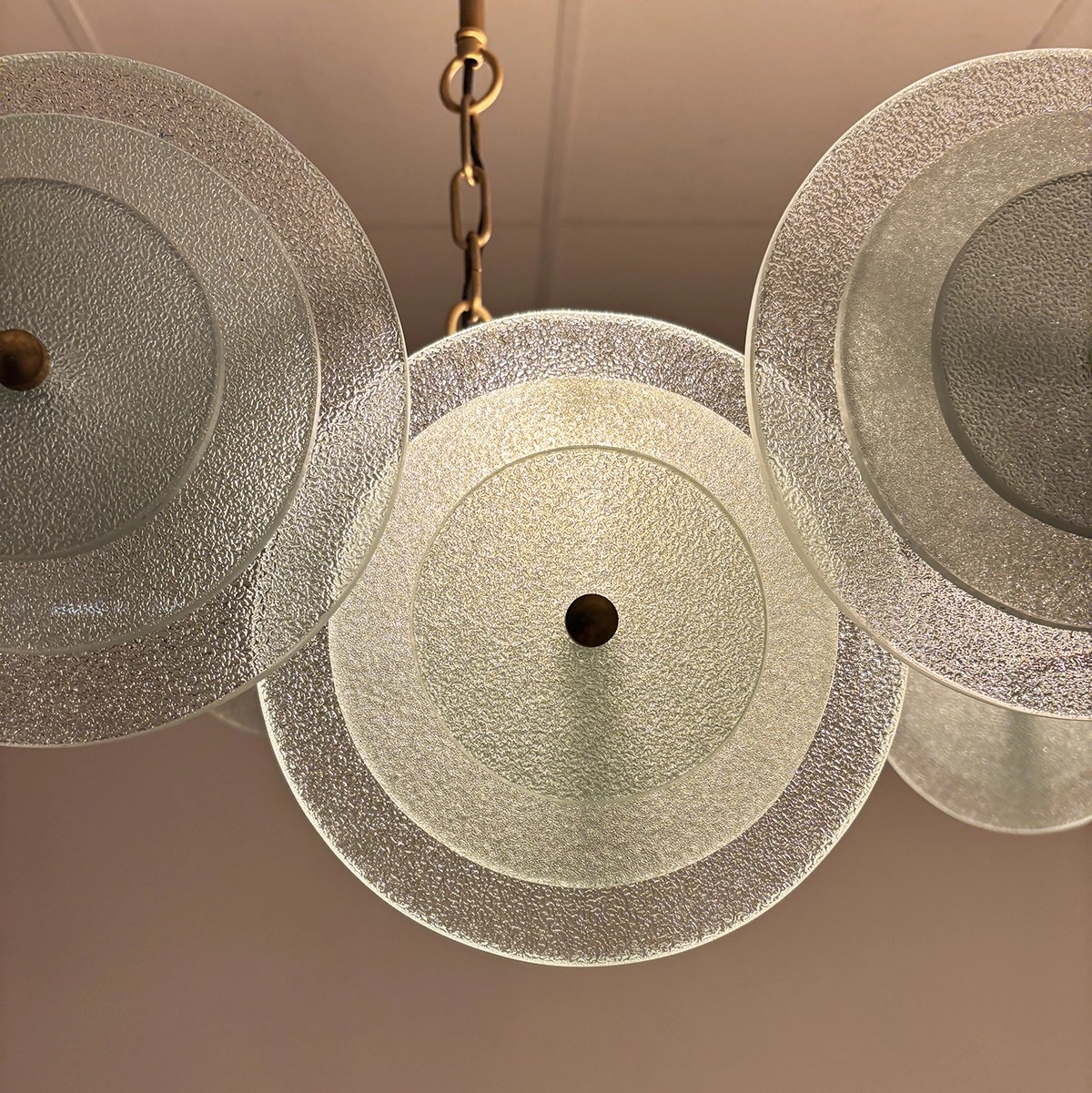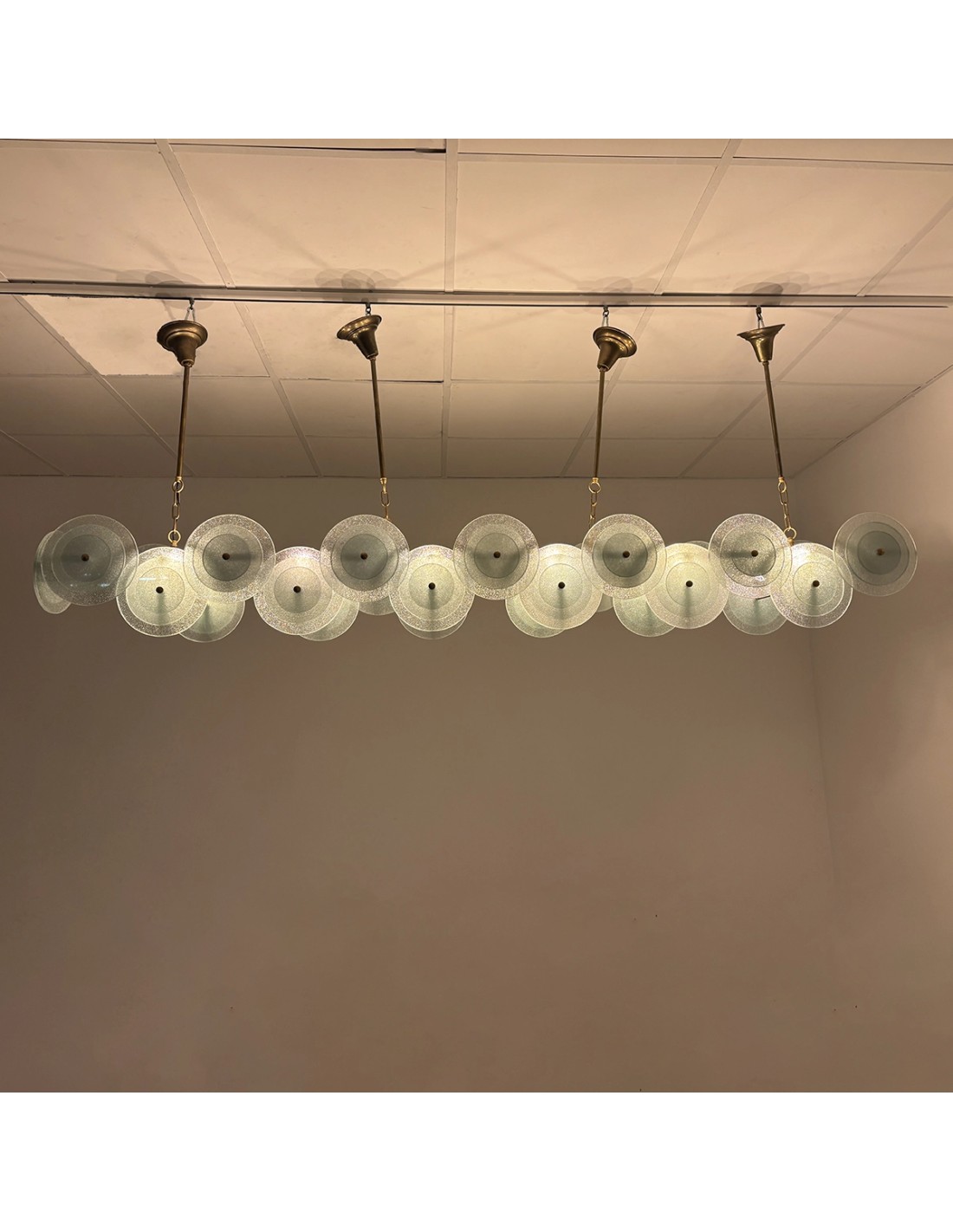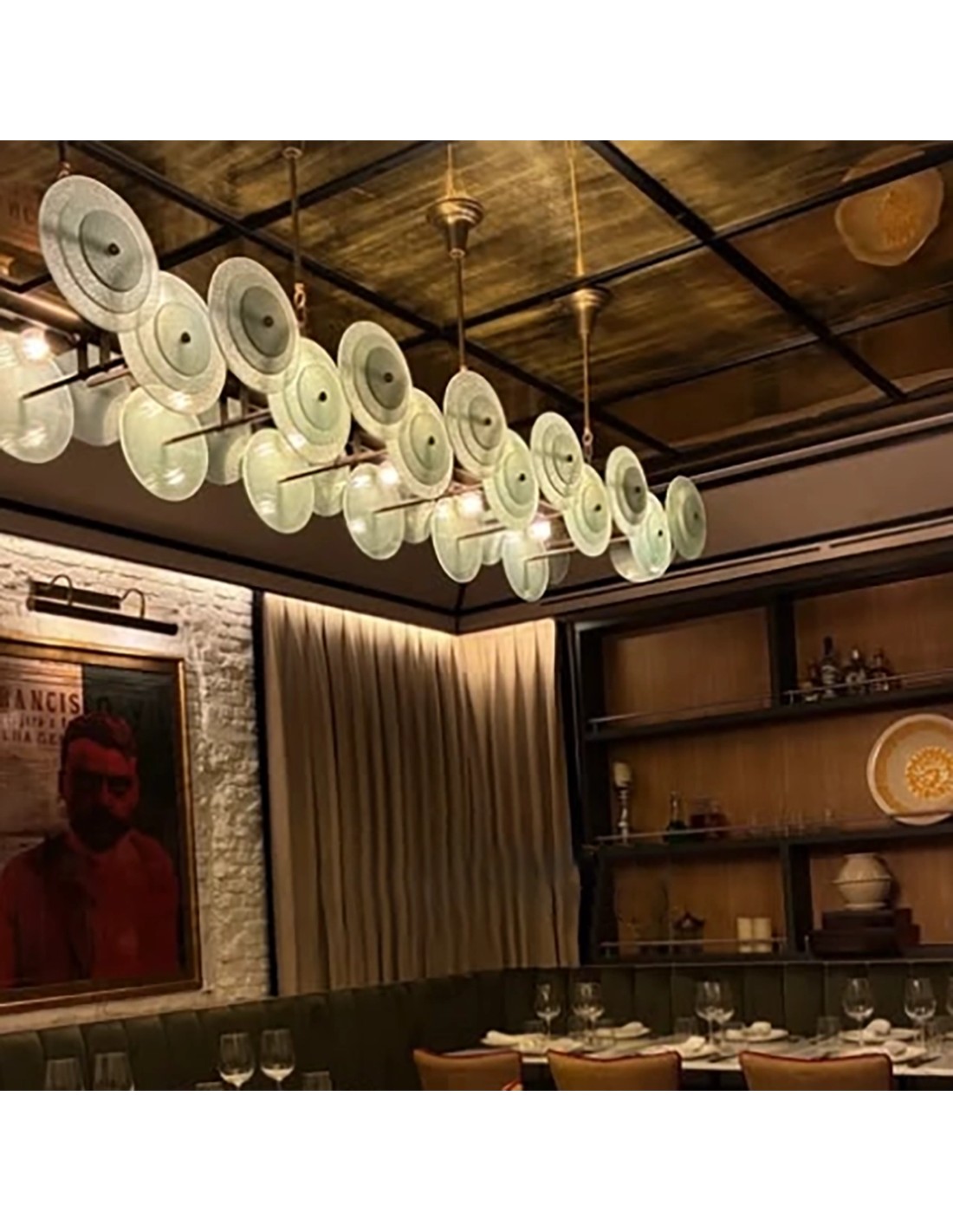 The Valo lamp is a linear piece with great visual presence, designed to become the focal point of the space. Made of metal with an aged brass finish, it combines an elegant structure with a succession of textured glass discs that filter the light, creating a warm, enveloping and sophisticated effect.