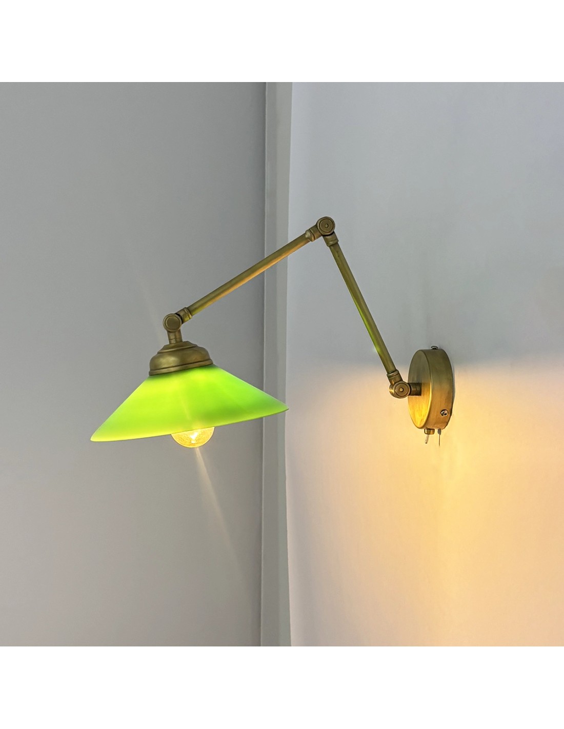 Vintage interior wall light Doris model from the Luz Vintage lighting brand with sku 01/A108 and GTIN 8436593095529. Manufactured and with handcrafted finishes, this wall lamp is made with two arms in a vintage aged brass effect finish and articulated with ball joints that allow the mobility of the lamp to adapt it better and a green glass shade. The green color perfectly highlights the tone of the wine racks in vintage-inspired bars and restaurants. It is equipped with a switch installed in the base and is very easy to install, you just have to screw the ceiling rose to the wall. It works with an LED bulb with an E27, 12W socket as maximum power and spherical shape (it is important to choose this type of bulb to facilitate installation inside the lampshade). Don't worry about the intensity of the light, since the LED is much more powerful than incandescent lamps. We recommend the use of vintage design LED bulbs to achieve an elegant and warm light effect. This vintage luminaire produces a soft warm light ideal for illuminating wine cellars, furniture, closets... This vintage lamp can also be placed as a hallway lamp or as a kitchen lamp.