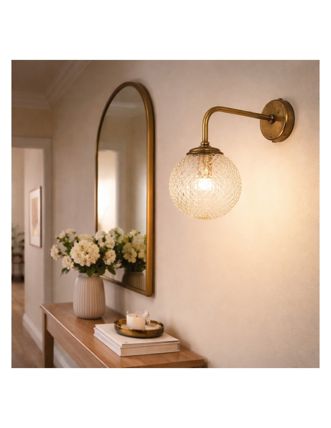 This vintage wall light from the new Luz Vintage collection is made using a metal arm from which a crystal ball with a transparent pineapple relief hangs. This easy-to-install vintage wall lamp has a very elegant vintage style, ideal for interior and decoration projects such as restaurants, hotels or vintage decoration venues. Use this vintage lamp as a kitchen wall light or bedroom lamp. All vintage lamps work with LED technology, which is much more efficient and sustainable than the usual incandescent light. As we are manufacturers and experts in vintage lighting, you can consult the possibility of modifying the finish and measurements of all our vintage lamps. Check at info@luzvintage.es conditions and discounts for professionals.
